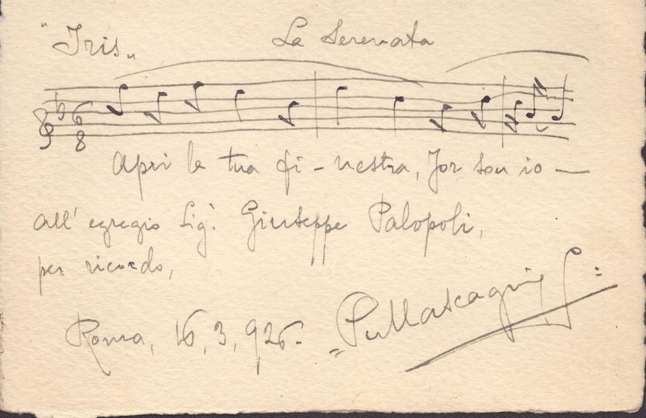 cm.14x9 Cartoncino con rigo musicale tratto da Iris - La serenata della parte Apri la tua finestra, for son io con aggiunta di dedica e firma autografe del maestro Pietro Mascagni. Datata Roma 16.3.926 , misure circa cm.9x14, in ottime condizioni