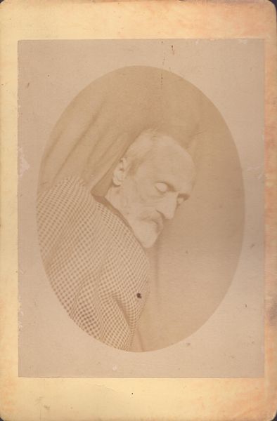 Foto originale Alinari montata su cartoncino formato gabinetto, che ritrae Giuseppe Mazzini nel suo letto di morte, ormai deceduto. Il cartoncino al retro porta la firma del fotografo, scritta autografa ad inchiostro nero G.Alinari Premiato - Pisa - Palazzo Toscanelli - Proprietà Artistica Riproduzione Proibita.