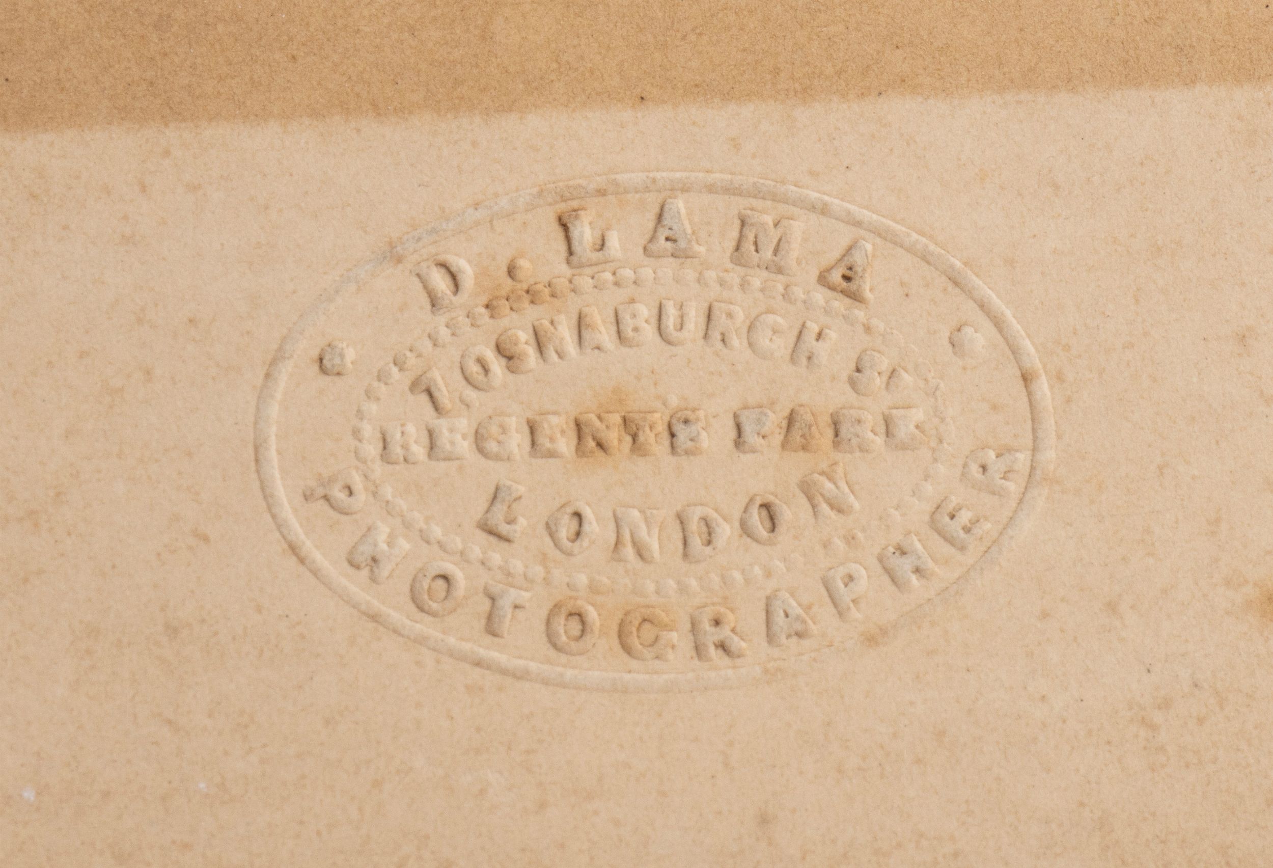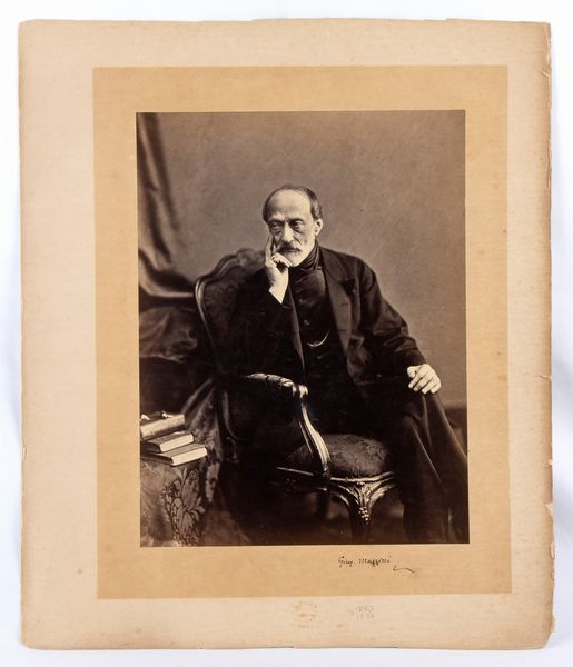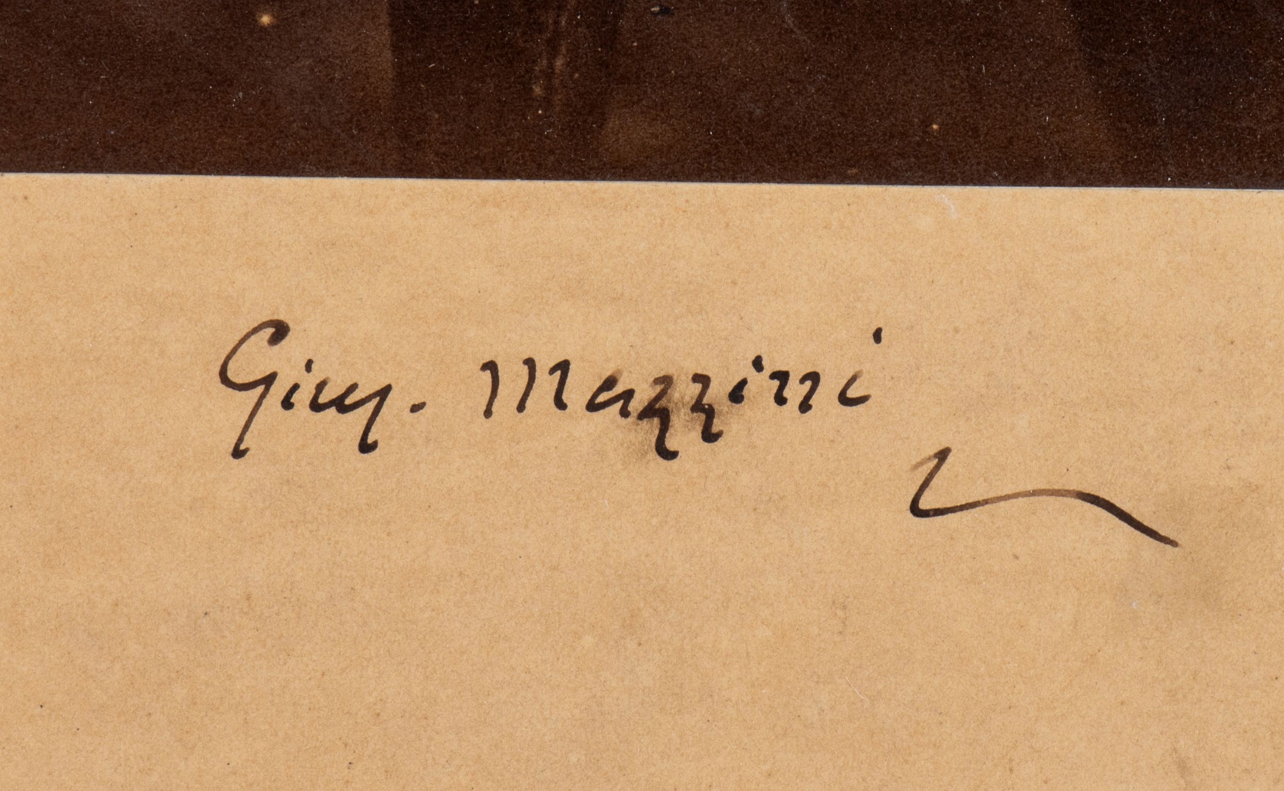 cm.25,5x33,4 Foto autografa di Giuseppe Mazzini. Grande foto b/n con passepartout finto montata su cartoncino. Autografo Gius.Mazzini originale, inchiostro nero (in calce sul passepartout finto, intorno alla foto). Timbro a secco ovale che riporta in rilievo i dati del fotografo D.LAMA PHOTOGRAPHER / J. Osnaburgh St. / REGENTS PARK / LONDON a testimonianza della permanenza londinese di Mazzini. Misure della foto cm.25,5x33,4 il cartoncino misura cm.40,8x48 - In perfette condizioni, bordi del cartoncino con usura e tagli. Al retro del cartoncino appunto ad inchiostro nero D.LAMA PHOTOGRAPHER - 45 Brompton Square - LONDON