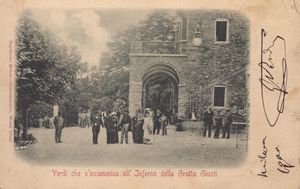 9x14cm Cartolina b/n con Verdi che s'incammina alla Grotta Giusti (Monsummano Terme), viaggiata per Bologna , [..]