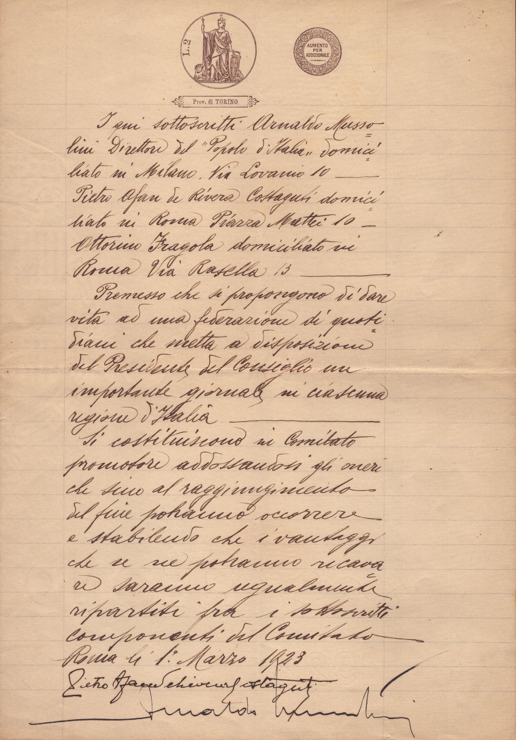 Il contratto recita I qui sottoscritti Arnaldo Mussolini direttore del Popolo d'Italia domiciliato in Milano <...> Pietro Afan de Rivera Costaguti domiciliato in Roma <...> Ottorino Fragola domiciliato in Roma <...> Premesso che si propongono di dare vita ad una federazione di quotidiani che metta a disposizione del Presidente del Consiglio un importante giornale su ciascuna regione d'Italia - Si costituiscono il Comitato promotore addossandosi gli oneri che sino al raggiungimento del fine potranno occorrere e stabilendo che i vantaggi che se ne potranno ricavare saranno ugualmente ripartiti fra i sottoscritti componenti del Comitato - Roma li 1' Marzo 1923
