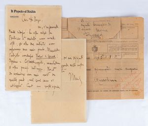 Lettera di due fogli, su carta intestata in blu IL POPOLO D'ITALIA - DIREZIONE , scritta ed autografata di pugno da Benito Mussolini.
