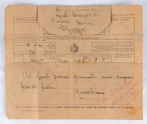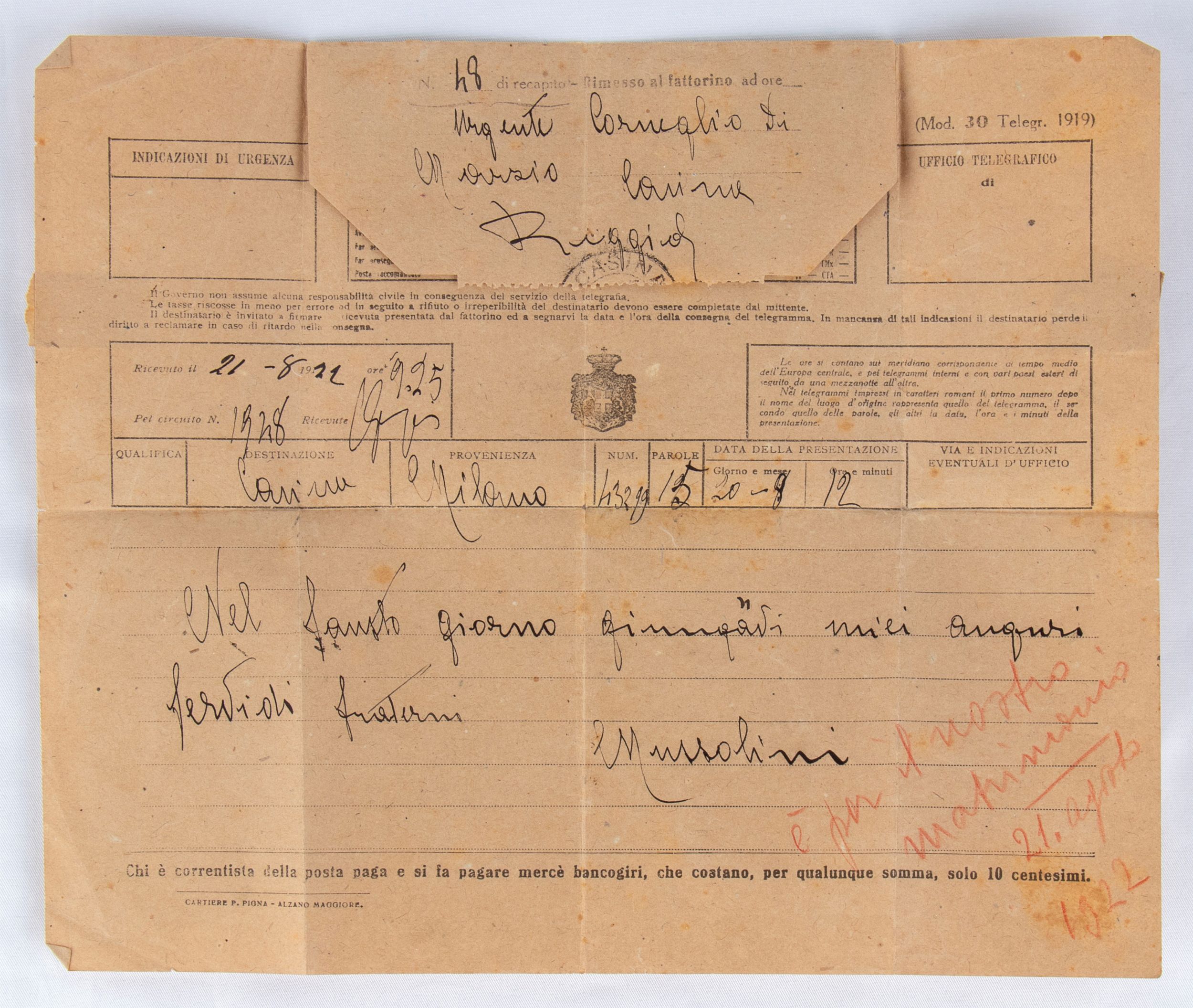 Insieme alla lettera un telegramma con testo dettato da Mussolini, ed indirizzato anche questo al Di Marzio, datato 21 Agosto 1922