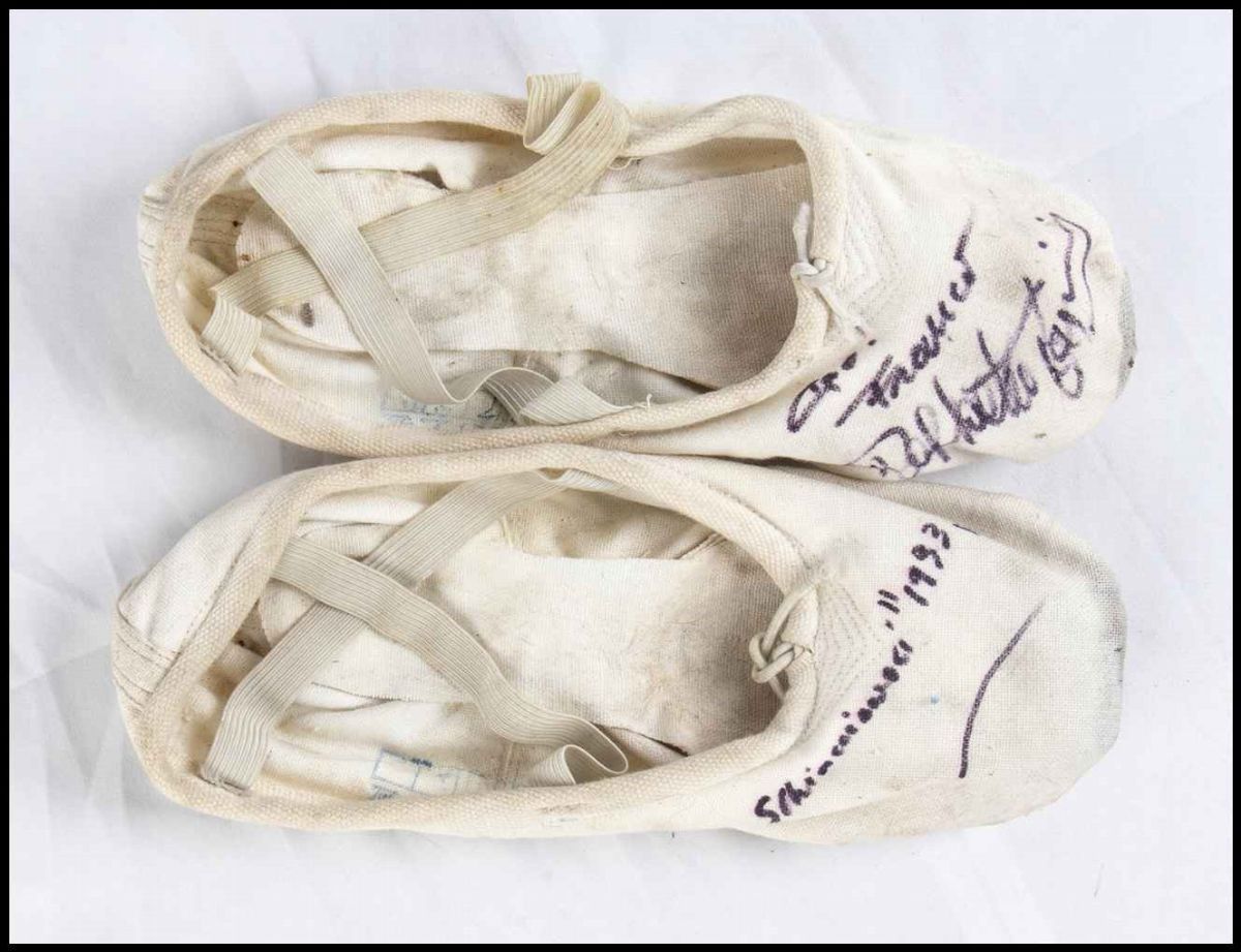 Memorabilia Spettacolo, Cinematografia... Paio di scarpette mezzepunte da danza classica, in tessuto bianco, con dedica ed autografo originali scritti a pennarello nero da Raffaele Paganini. Usate nello Schiaccianoci , 1993. Famoso ballerino italiano, attore, nominato Danseur étoile dall'Opera di Roma.