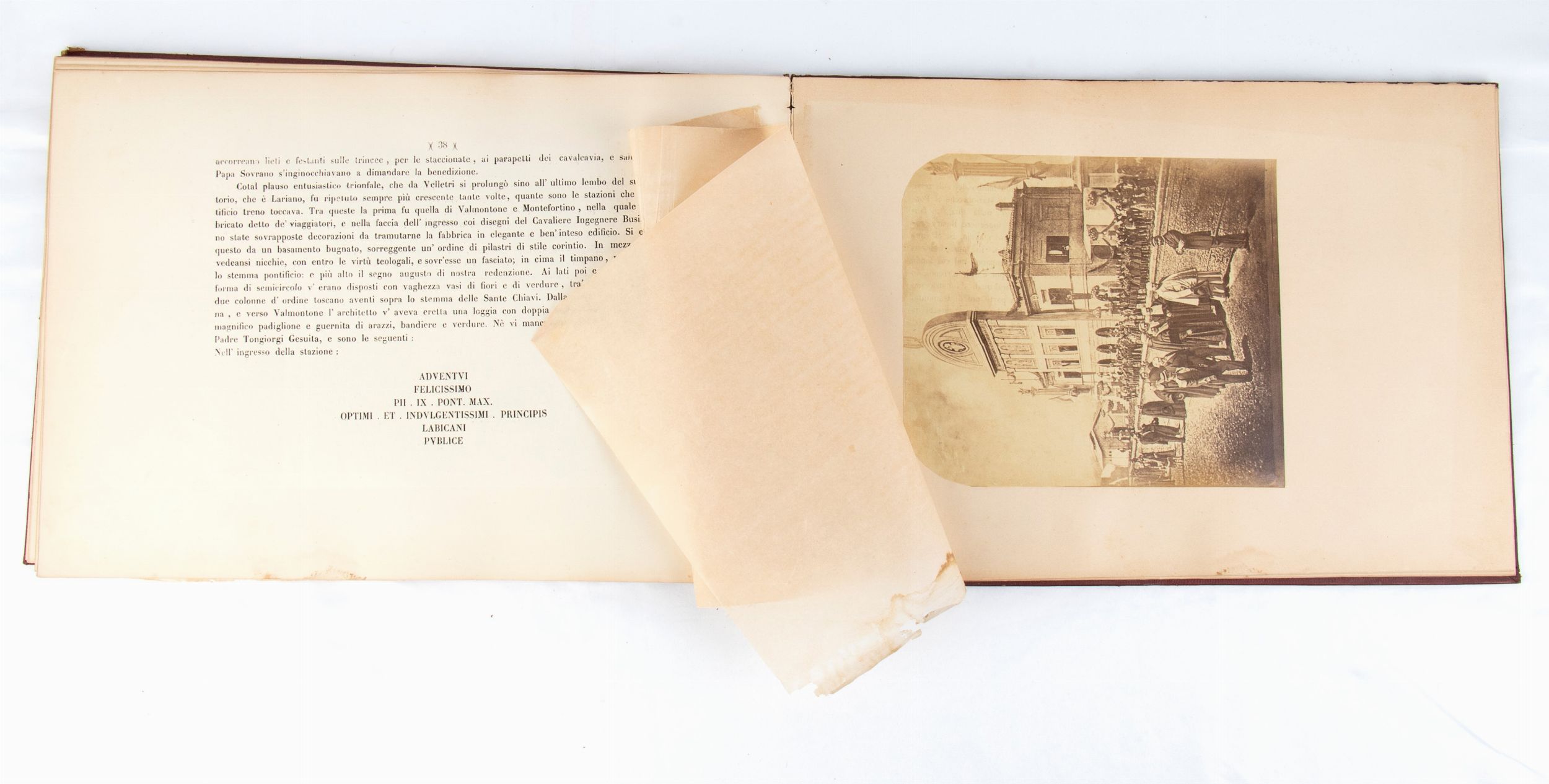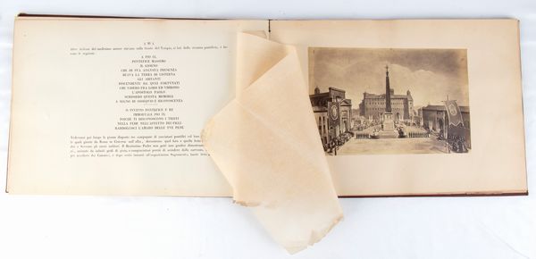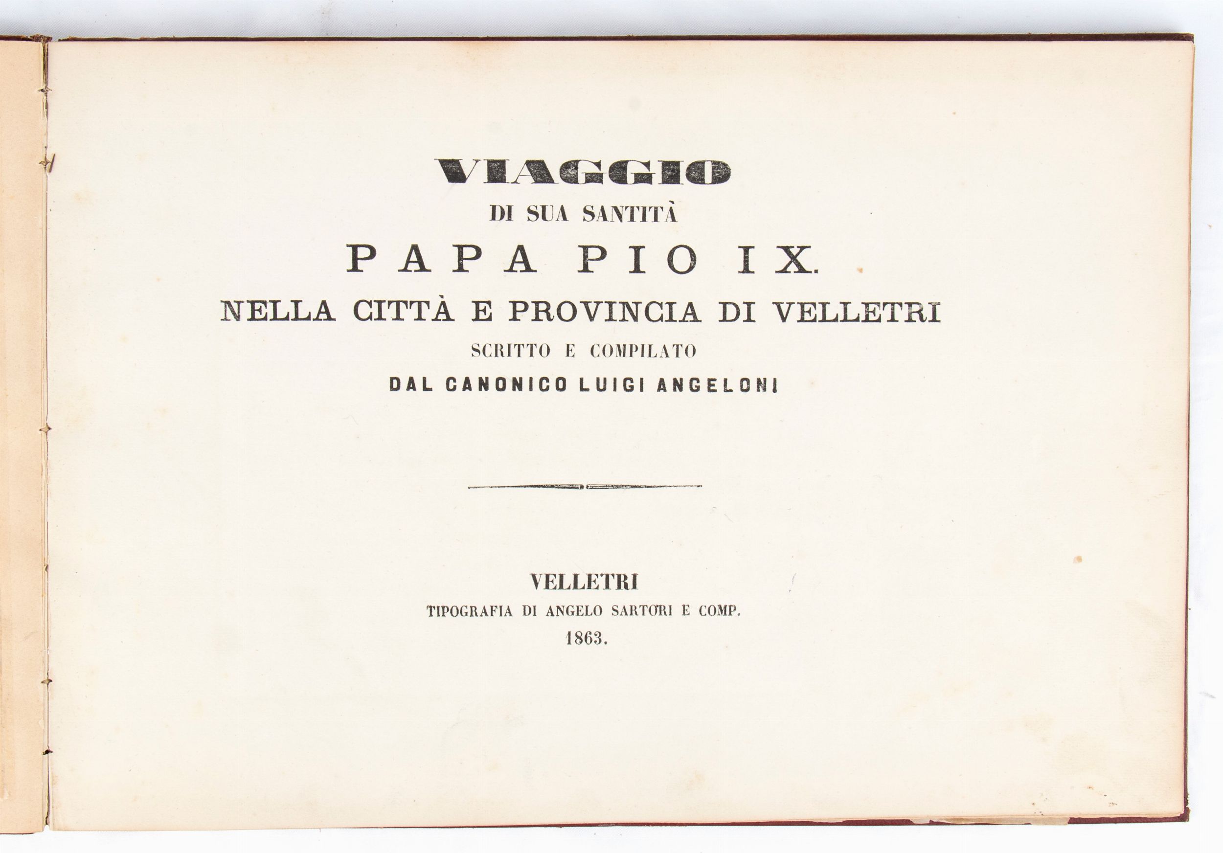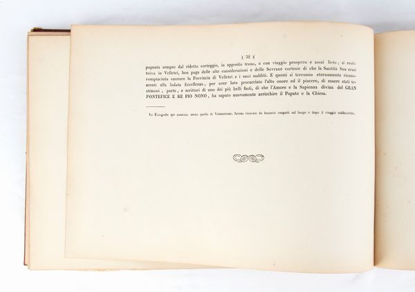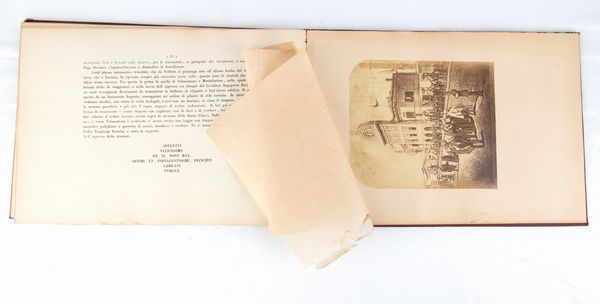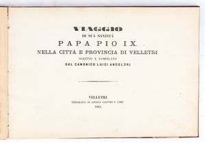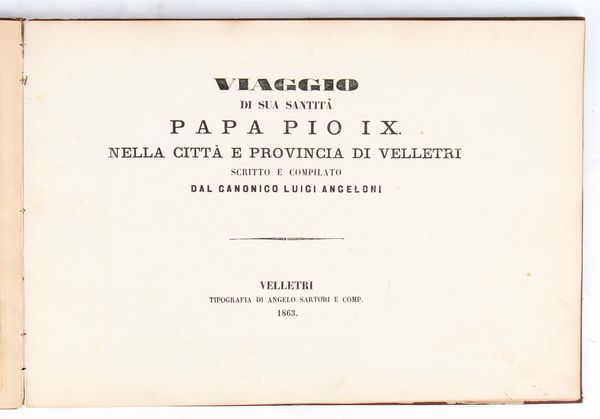 Rarissimo documento bibliografico, in formato oblungo, misure circa cm.28x41 , legatura coeva in piena tela copertina rigida in similpelle rossa, piatti impressi a secco in oro con stemma pontificio Mastai Ferretti al centro e cornice ed angoli a richiami floreali, pagine 52 più una bianca alla fine, grande foto cm.18x23 protetta da velina di Sua Santità PIO IX all'antiporta, 7 foto e riproduzioni artistiche (albumina) f.t. con veline di protezione. Frontespizio a caratteri neri VIAGGIO DI SUA SANTITA' PAPA PIO IX NELLA CITTA' E PROVINCIA DI VELLETRI / SCRITTO E COMPILATO / DAL CANONICO LUIGI ANGELONI / VELLETRI / TIPOGRAFIA DI ANGELO SARTORI E COMP. / 1863