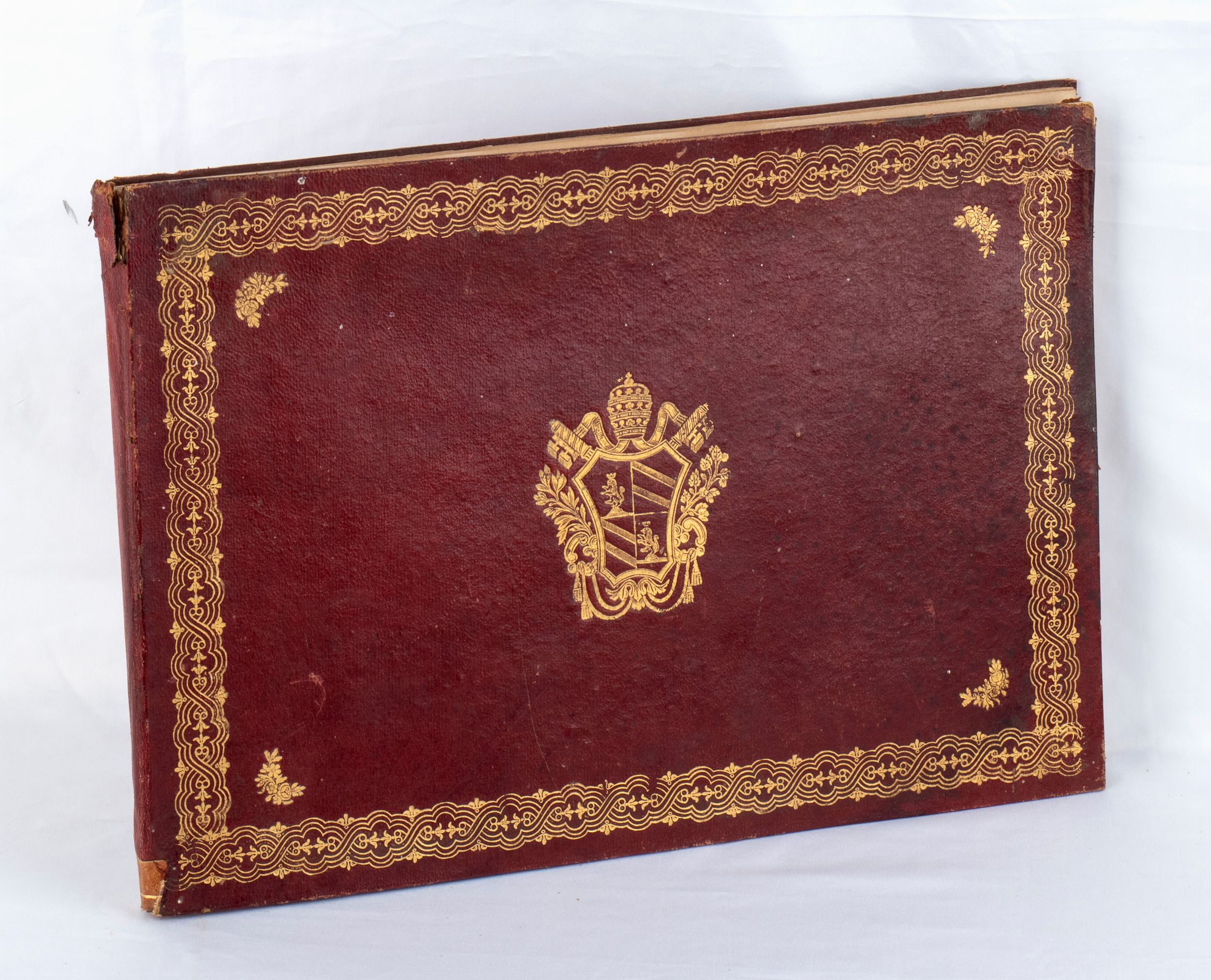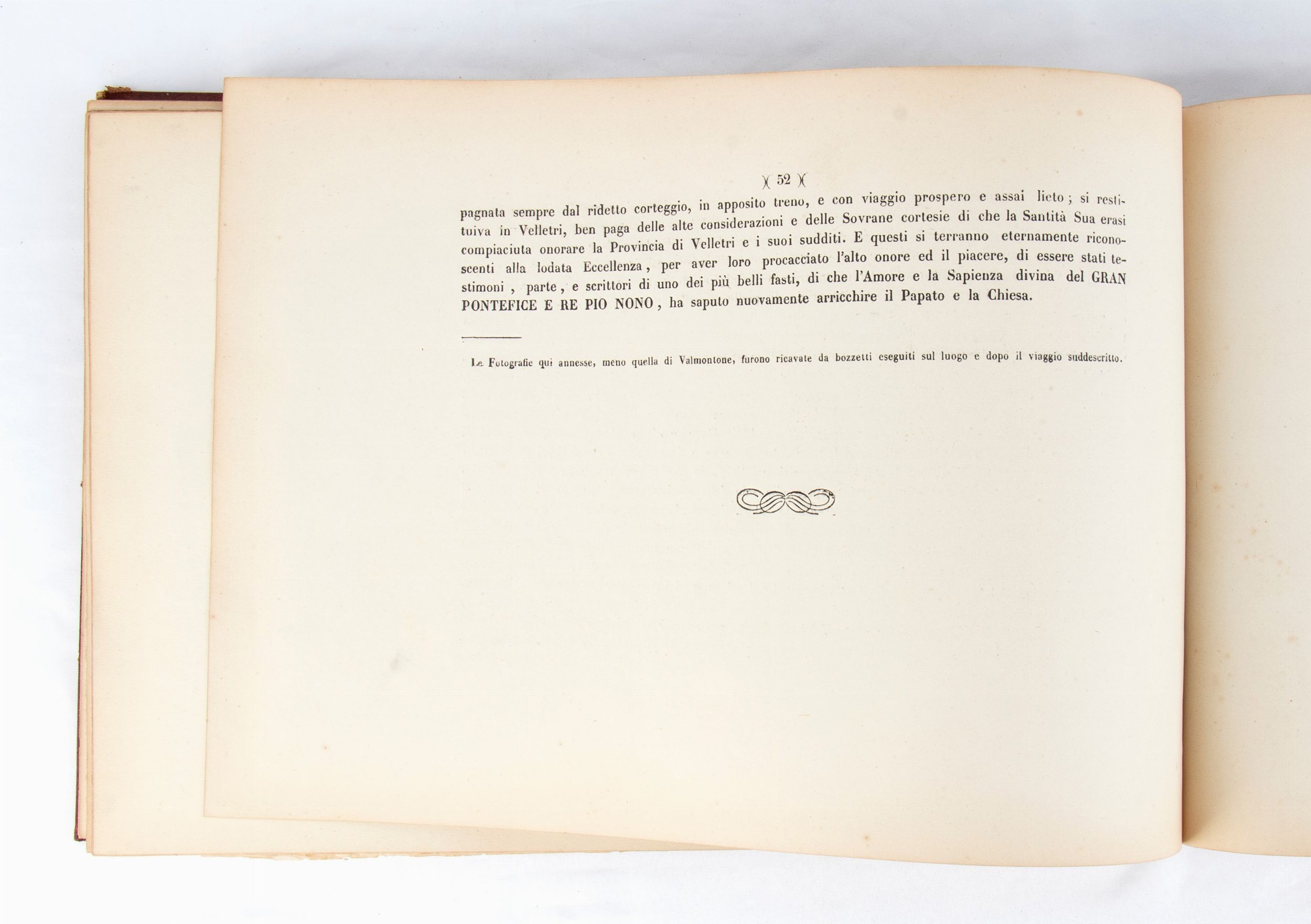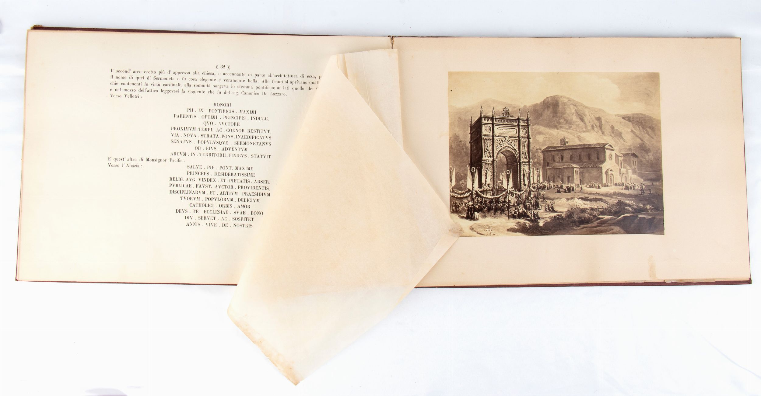 Rarissimo documento bibliografico, in formato oblungo, misure circa cm.28x41 , legatura coeva in piena tela copertina rigida in similpelle rossa, piatti impressi a secco in oro con stemma pontificio Mastai Ferretti al centro e cornice ed angoli a richiami floreali, pagine 52 più una bianca alla fine, grande foto cm.18x23 protetta da velina di Sua Santità PIO IX all'antiporta, 7 foto e riproduzioni artistiche (albumina) f.t. con veline di protezione. Frontespizio a caratteri neri VIAGGIO DI SUA SANTITA' PAPA PIO IX NELLA CITTA' E PROVINCIA DI VELLETRI / SCRITTO E COMPILATO / DAL CANONICO LUIGI ANGELONI / VELLETRI / TIPOGRAFIA DI ANGELO SARTORI E COMP. / 1863