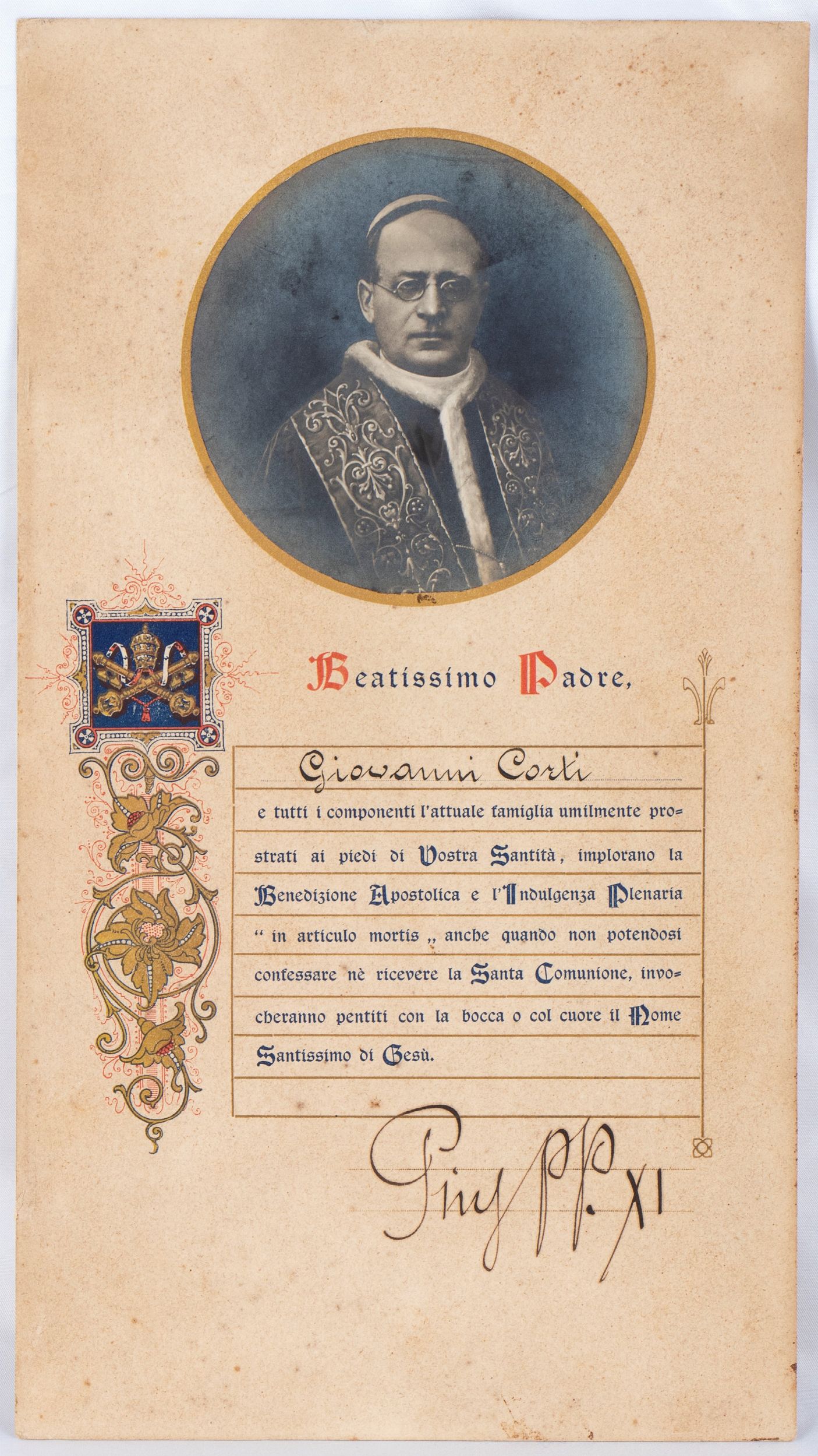 cm.18x33 Foto in b/n di taglio circolare, montata su cartoncino per benedizione apostolica, con firma originale autografa ad inchiostro nero del pontefice PIUS PP.XI - Misure del cartoncino cm.18x33 in buone condizioni, leggere macchie sparse