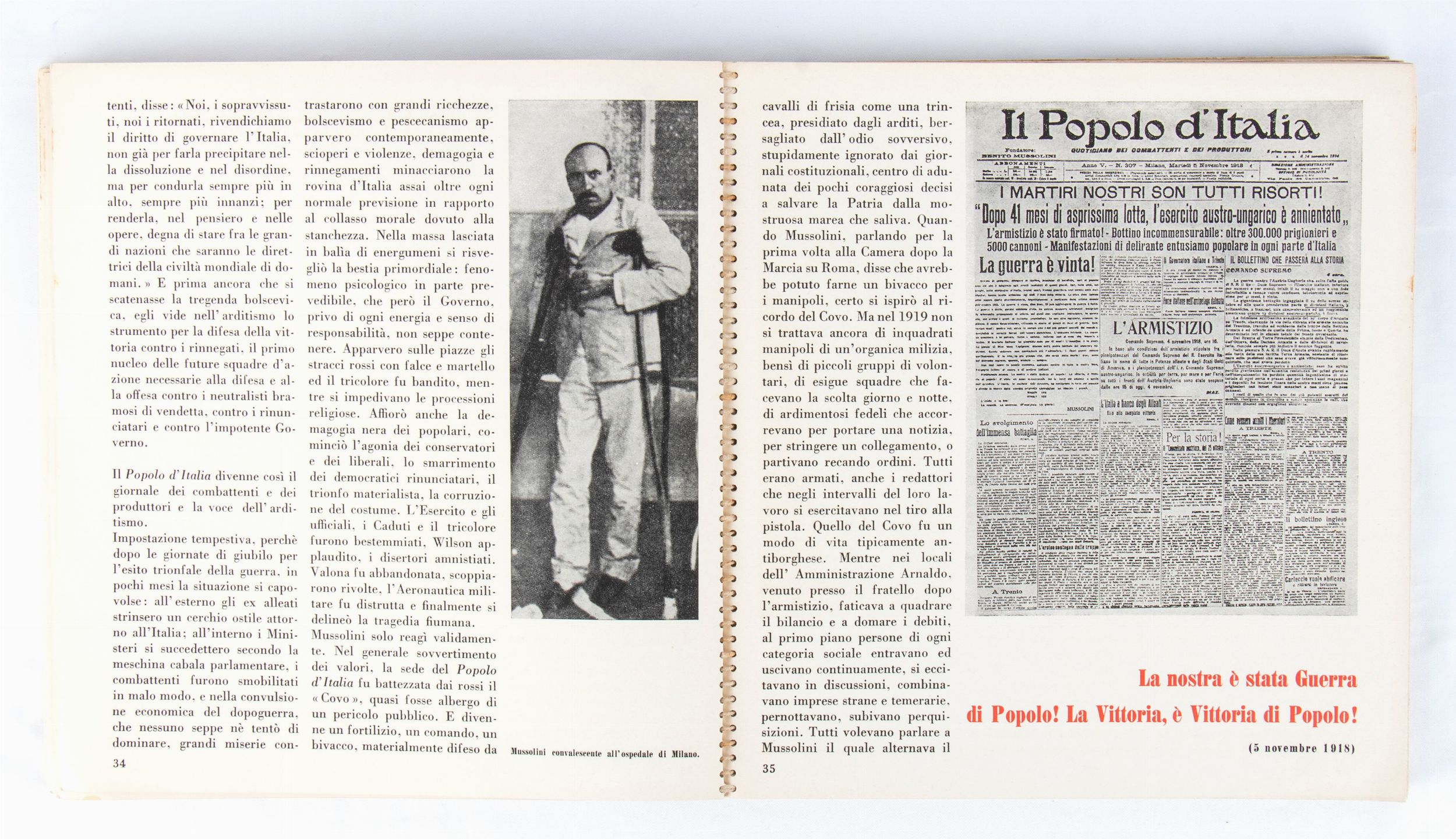 Volume edito dalla Scuola di Mistica Fascista SANDRO ITALICO MUSSOLINI. Impaginato da Giuseppe Pagano, realizzazione grafica dell'Istituto Raffaello Bertieri, in Milano, 1940 anno XVIII - In 8° quadrato, circa cm.24 x 24, pp. 82, (4), brossura editoriale con illustrazione fotografica ai piatti del covo, testo in rosso e in nero, interamente illustrato con fotografie in b.n. nel testo, legatura a spirale, pagine piegate alla cinese. Seconda edizione speciale di 2000 esemplari numerati, questo è il n. 1862 , ma non ha dedica.