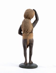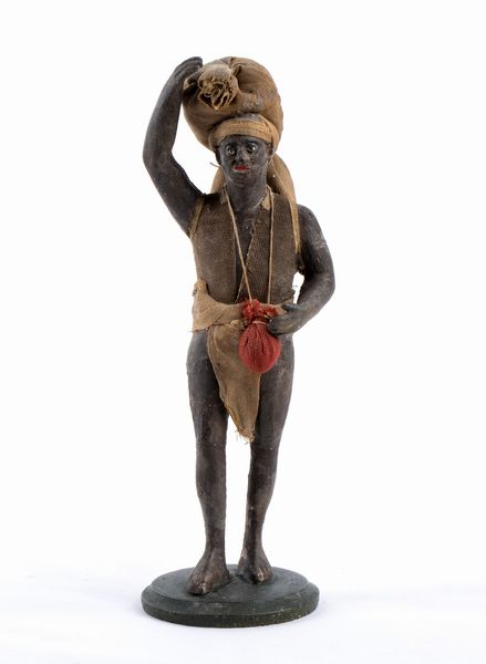 Terracotta, cm.17 Personaggio per presepe in terracotta dipinto a mano, con vestiti ed accessori in stoffa, su basetta circolare solidale. Servitore, portantino indigeno con il suo carico al seguito. Originale della metà del XIX secolo, probabile manifattura orientale, molto raro. Altezza circa cm.17 in ottime condizioni