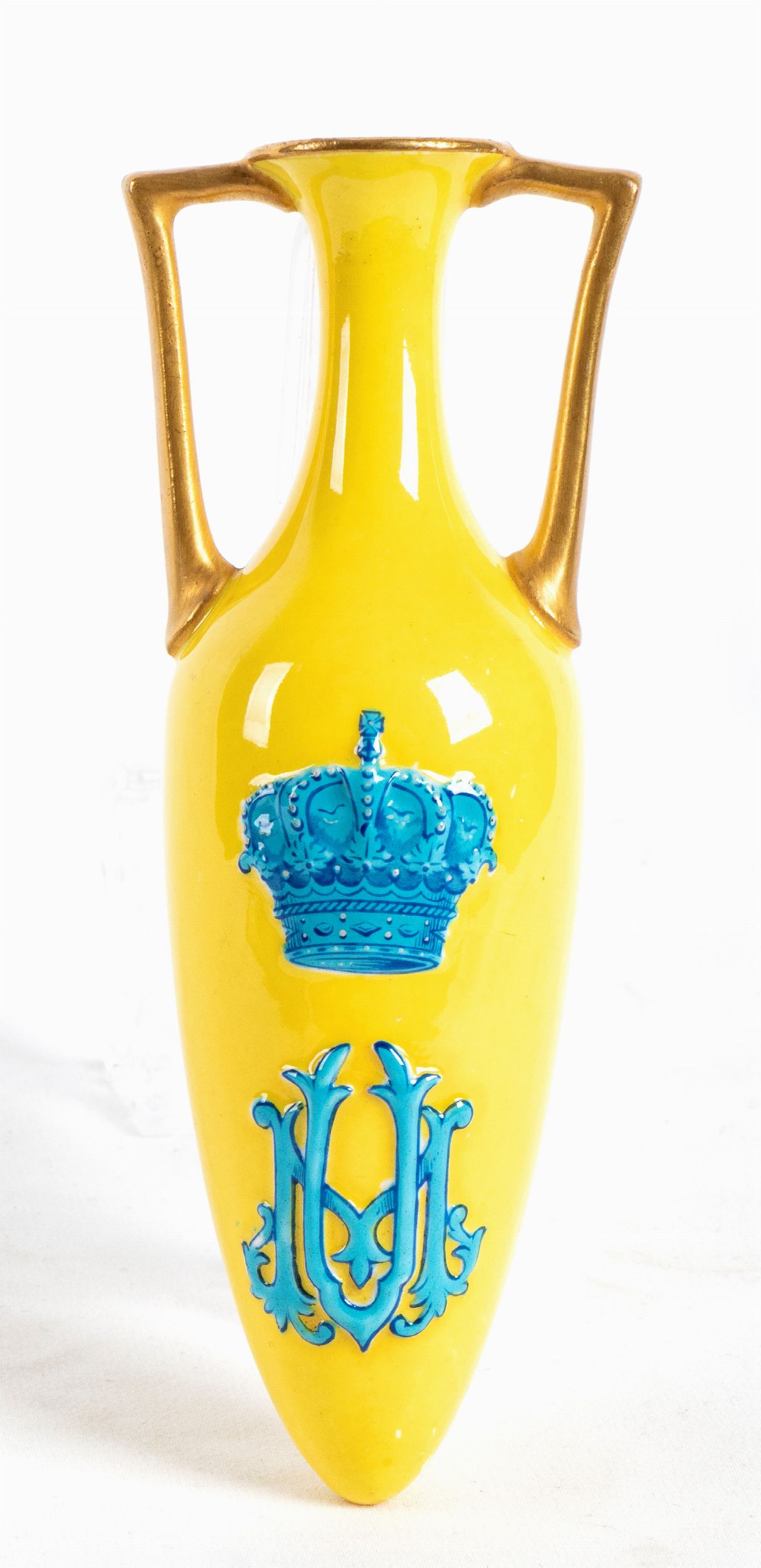 cm.14 MEMORABILIA STORICI - REGNO D'ITALIA, F... Rara bomboniera celebrativa per le nozze reali di UMBERTO I di Savoia, Re d'Italia, e MARGHERITA, avvenute il 22 Aprile 1868. Realizzata in ceramica, dai bei colori giallo e blu, con profilature oro ed interno bianco. Originale del 1868, in perfette condizioni, misura cm.14