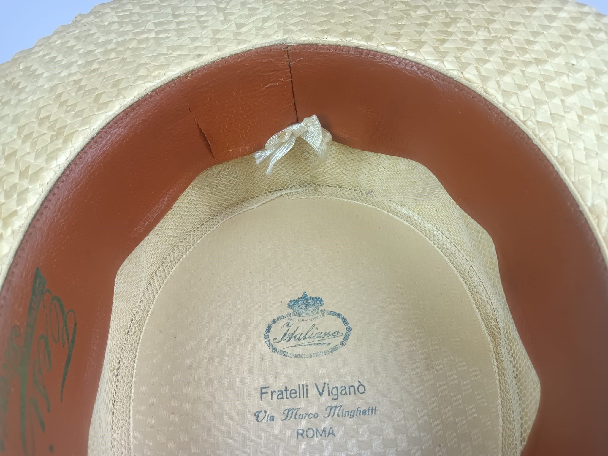 Al suo interno sono presenti le lettere ADC ricamate in filo rosso su targhetta in stoffa nera. Fabbricante Tesi, Firenze – Fratelli Viganò, Roma. La paglietta in oggetto è quasi uguale a quella indossata da Totò nella foto autografata nel 1919, anche questa in asta.