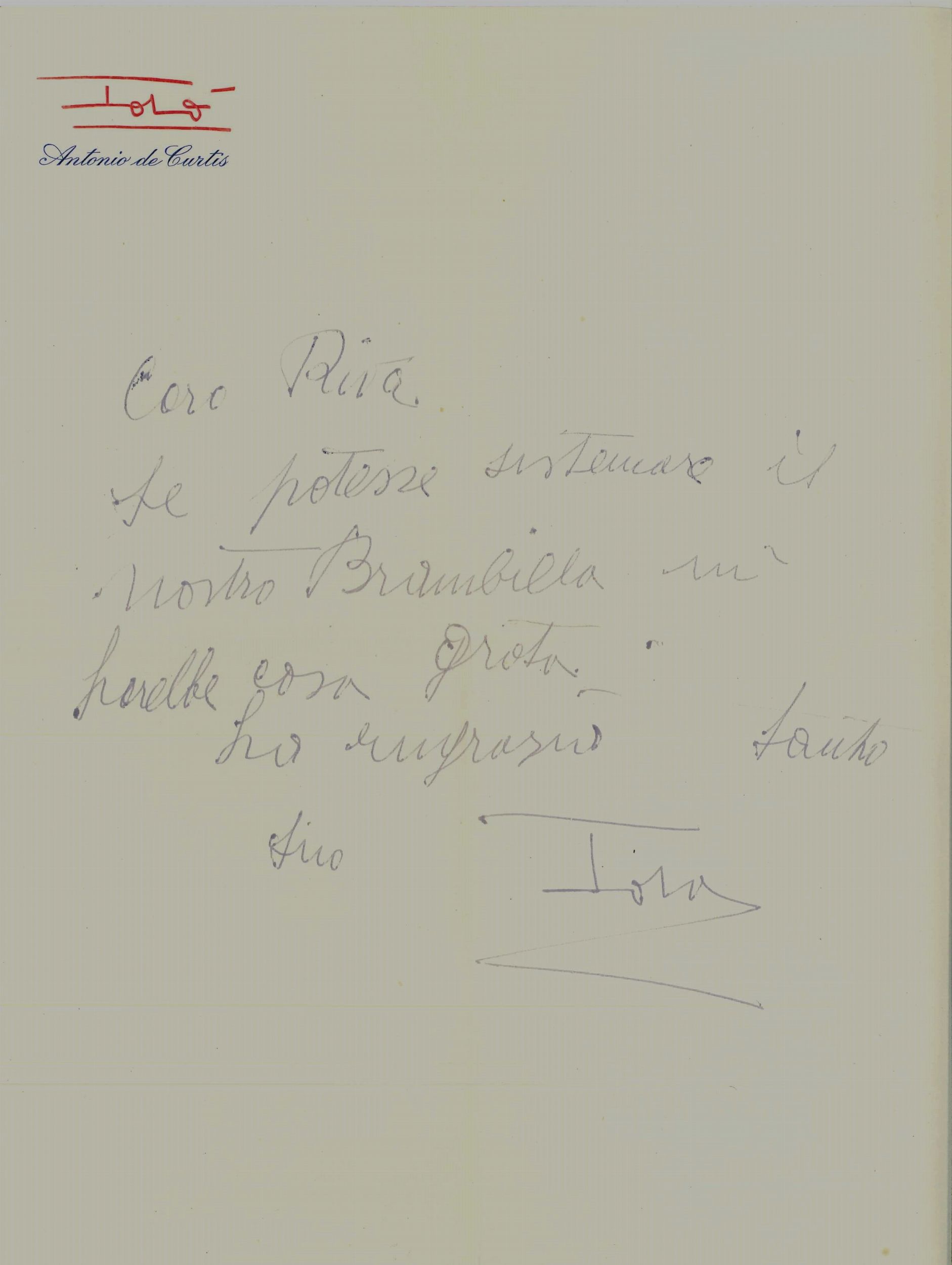 Lettera su carta intestata TOTO' Antonio De Curtis con logo a rilievo, anni 50, indirizzata a Mario Riva in cui Totò, scrivendo di suo pugno con firma, presenta e raccomanda il ragionier Brambilla. Di conseguenza il ragionier Brambilla lavorò molto tempo al servizio di Mario Riva.