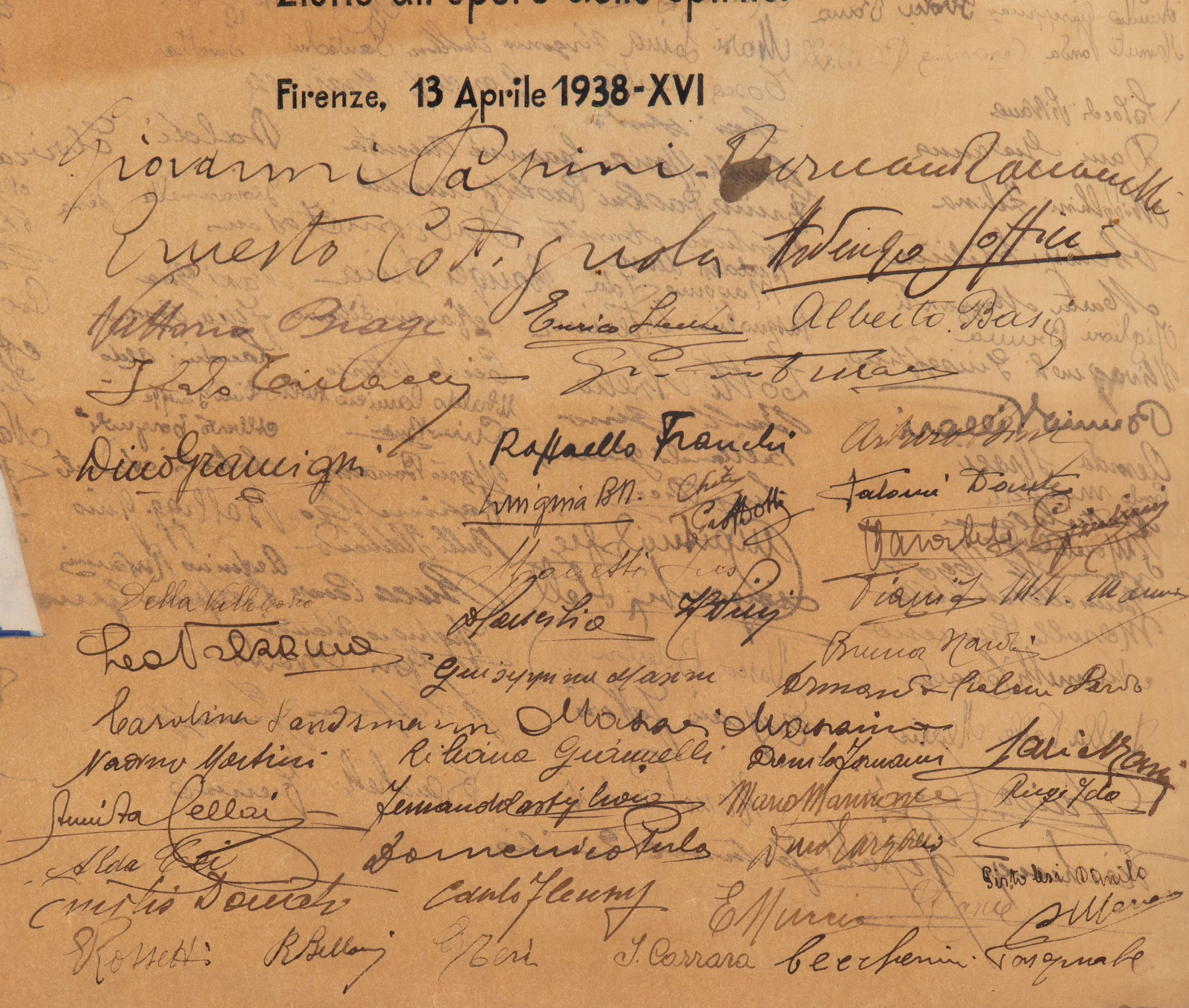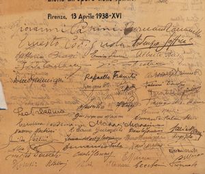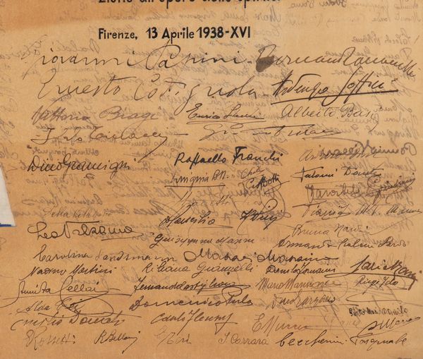 Foglio in carta pergamena, dipinta a mano, donata ad Attilio Vallecchi dai suoi operai, impiegati, e dagli scrittori con il testo che recita A Attilio Vallecchi Cavaliere del Lavoro offrono con lieto e concorde animo questa immagine, che nella luce dell'oro vuol significare il calore dell'affetto - gli Operai che lo sentono amorevole padre ; gl'Impiegati che riconoscono in lui il paziente amico ; gli Scrittori che sanno la sua fraterna fedeltà e la sua eroica devozione all'opere dello spirito. Firenze, 13 Aprile 1938 - XVI - Seguono un grande numero di autografi scritti ad inchiostro nero dove si riconoscono Giovanni Papini, Ernesto Codignola, Ardengo Soffici. In cornice con doppio vetro, misure della pergamena circa cm.37x50. In ottime condizioni