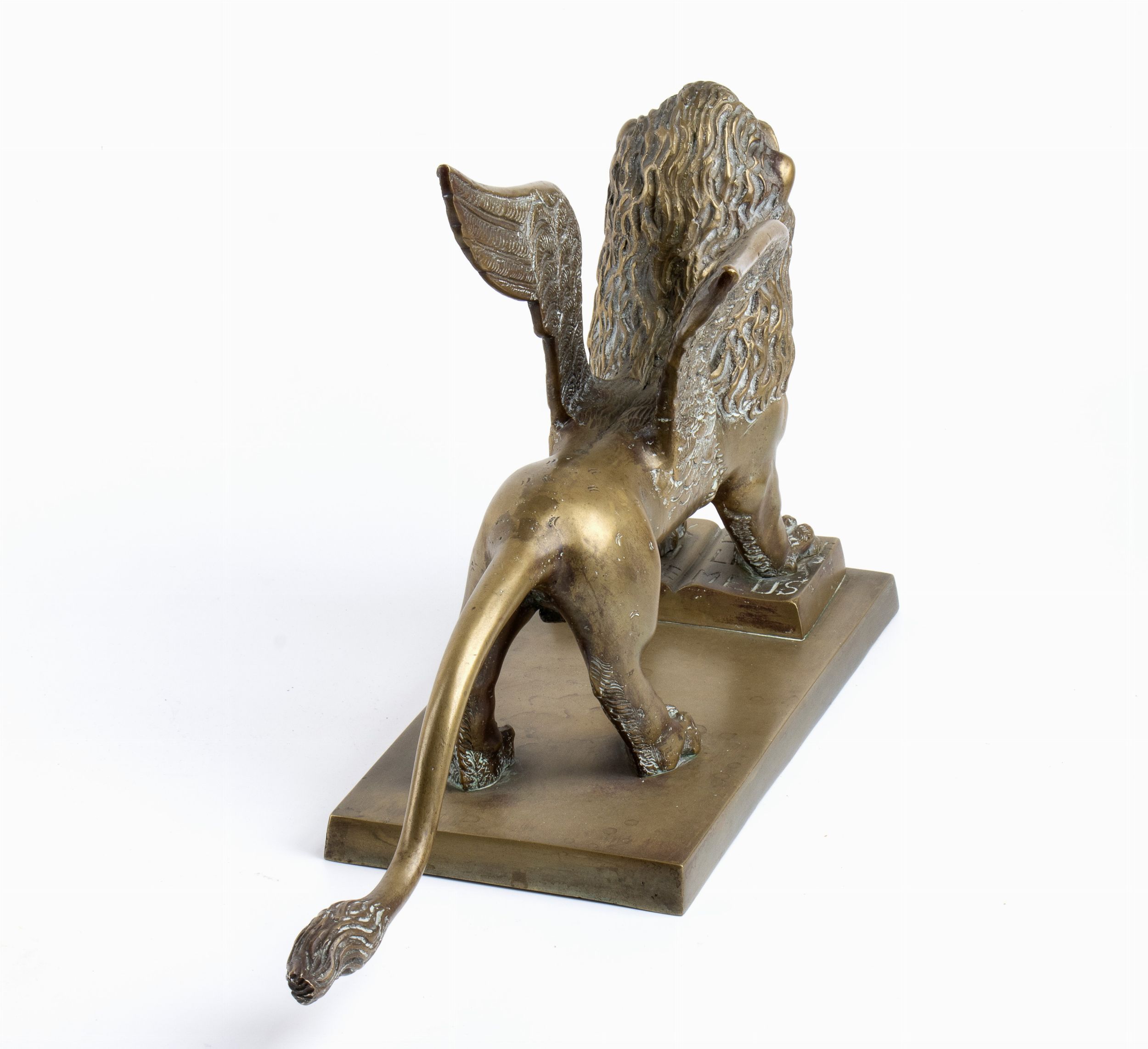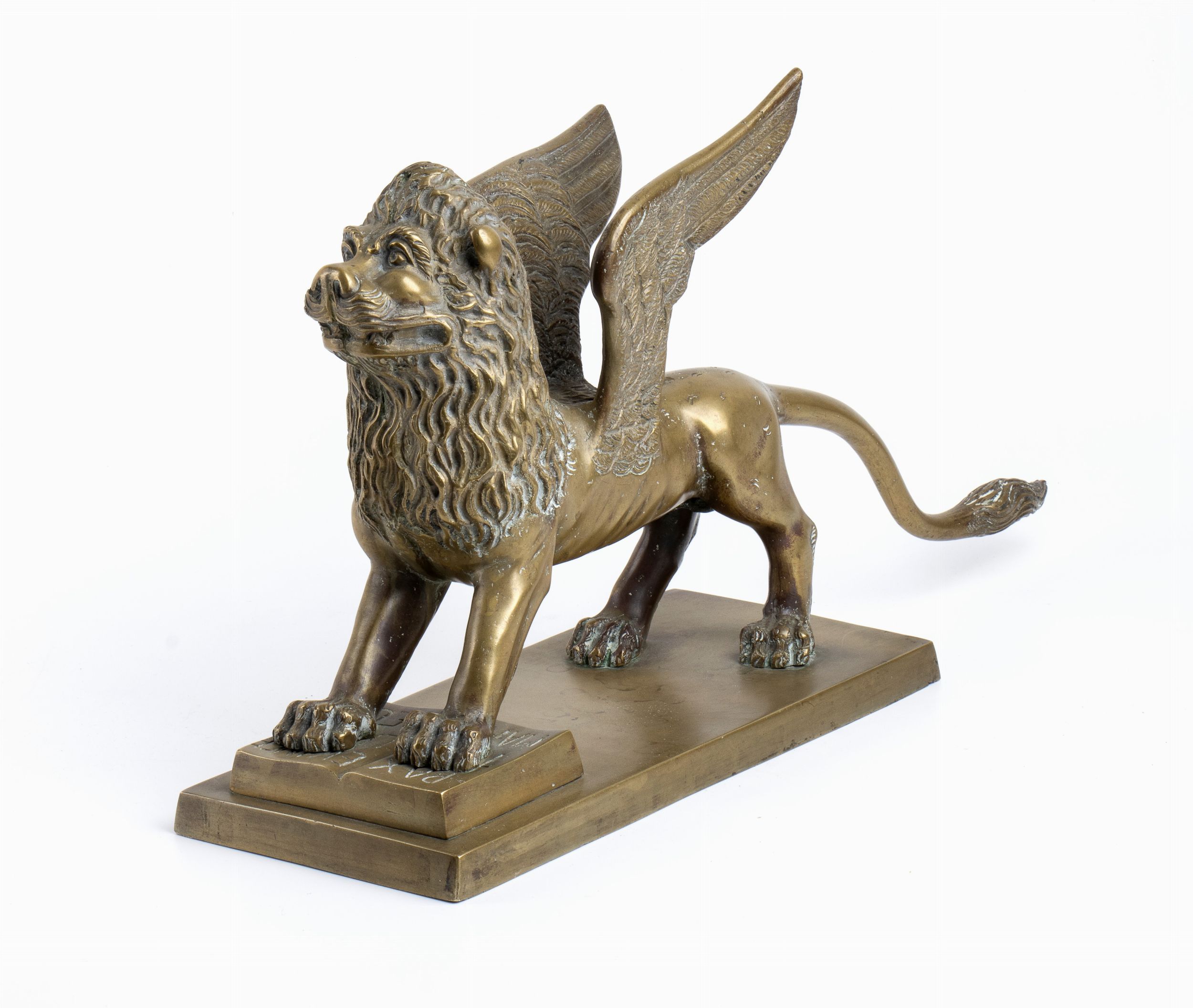 Bronzo raffigurante il leone alato di San Marco o Marciano, rappresentazione simbolica dell'evangelista Marco. La scultura riprende esattamente quella posta in cima alla colonna di piazza San Marco a Venezia, un ibrido fra un leone e un grifone, prodotto nel primo ellenismo orientale ad opera di un artista greco o greco-ionico, fra la fine del IV e l'inizio del III secolo a.C., poi rielaborato come leone alato. Sulle quattro zampe con le anteriori sulle pagine del libro aperto, dove si legge PAX TIBI MARCE / EVANGELISTA MEVS - Il leone misura cm.23x45, la base cm.25,3x30,5 , ed è in ottimo stato con bella patina. Primi decenni del XX secolo