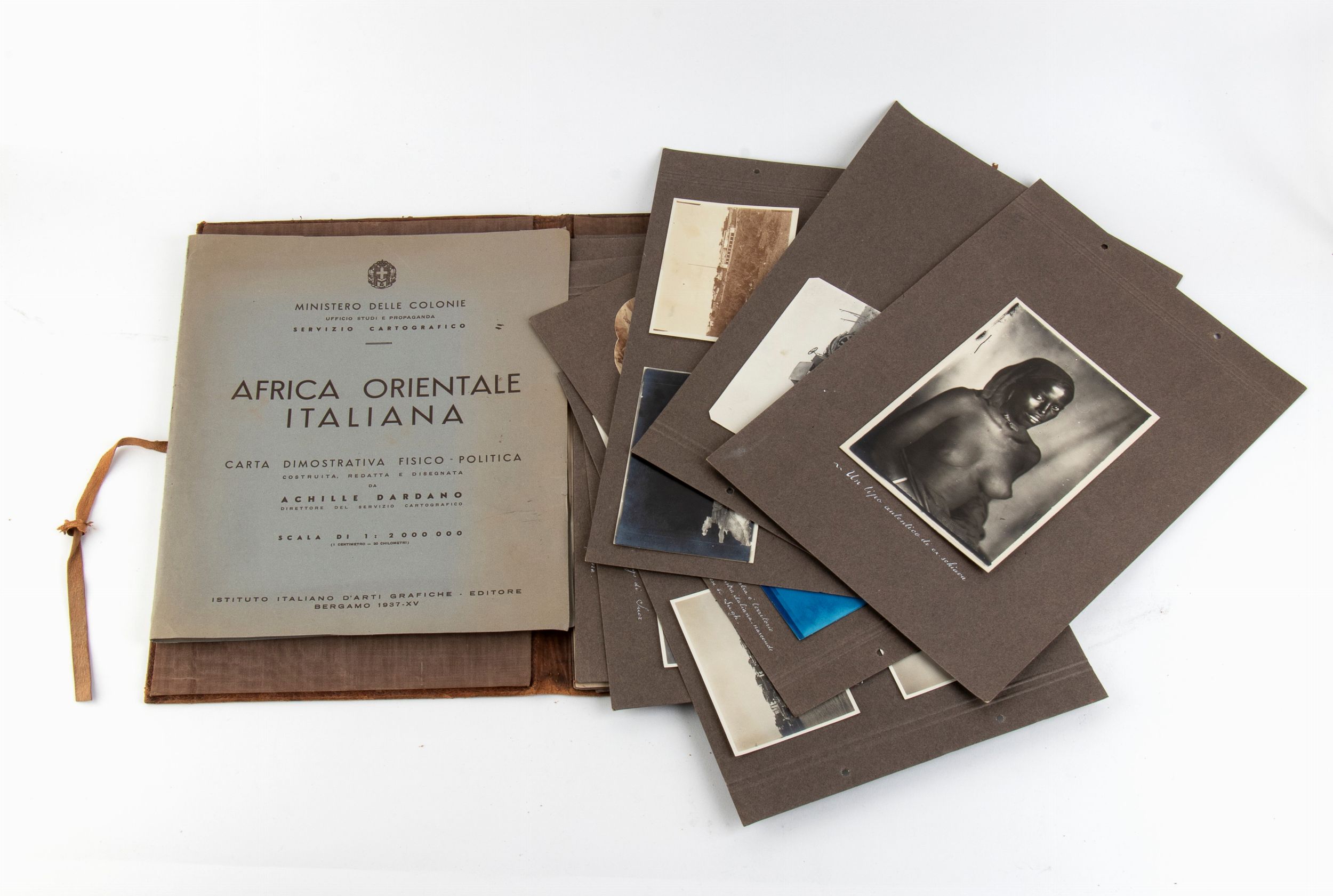 Album con raccolta di foto cartoline, foto private, opuscoli, di luoghi, militari italiani, ed indigeni dei territori colonici dell' Africa Orientale Italiana (AOI) , con altra cartellina in simil pelle per uffici della Corte dei Conti. Buono stato