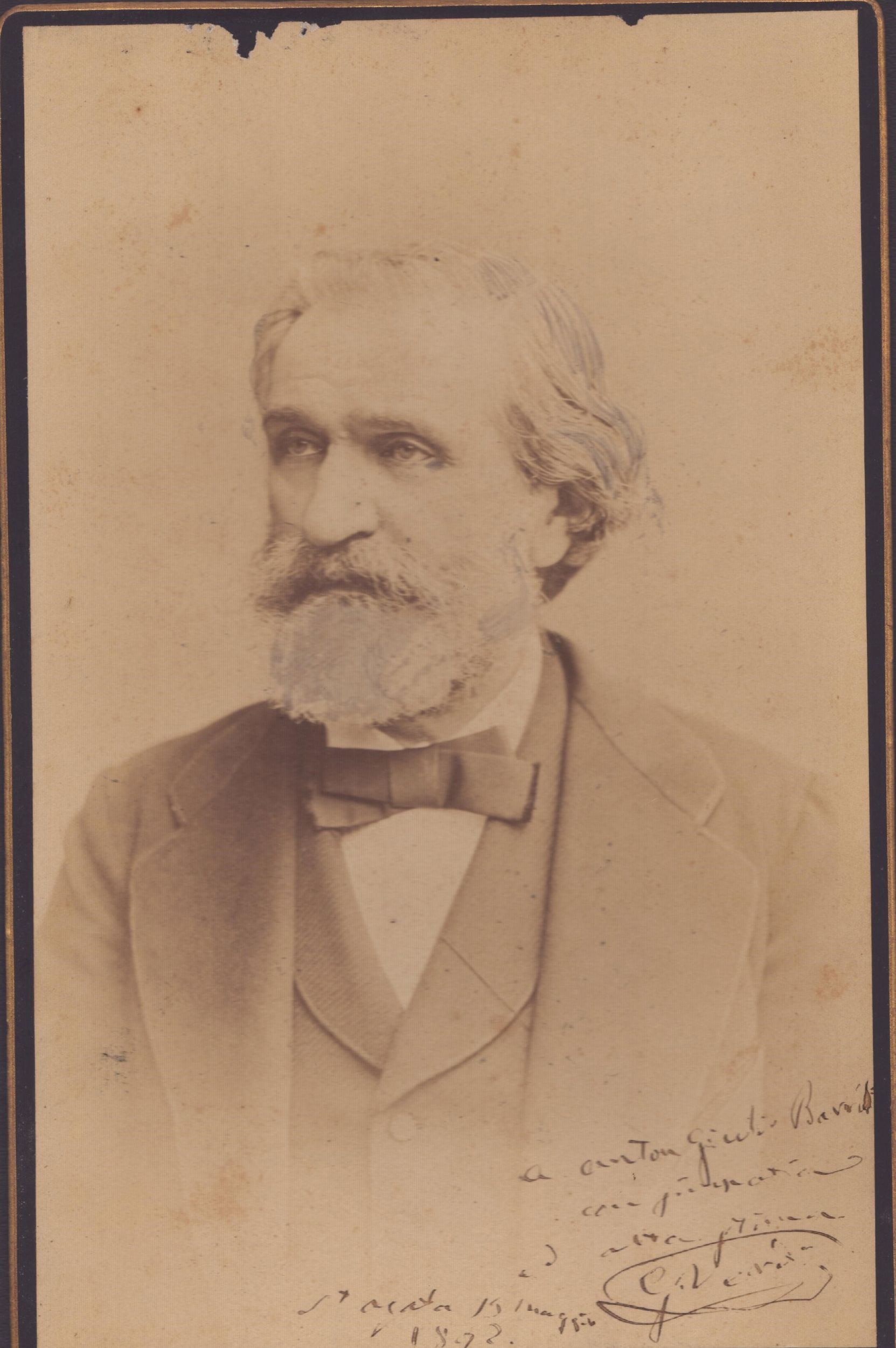 Fotografia del compositore con dedica e firma autografe, ad inchiostro nero A Anton Giulio Barrili con simpatia ed alta stima G.VERDI datata Maggio 1912 (?)
