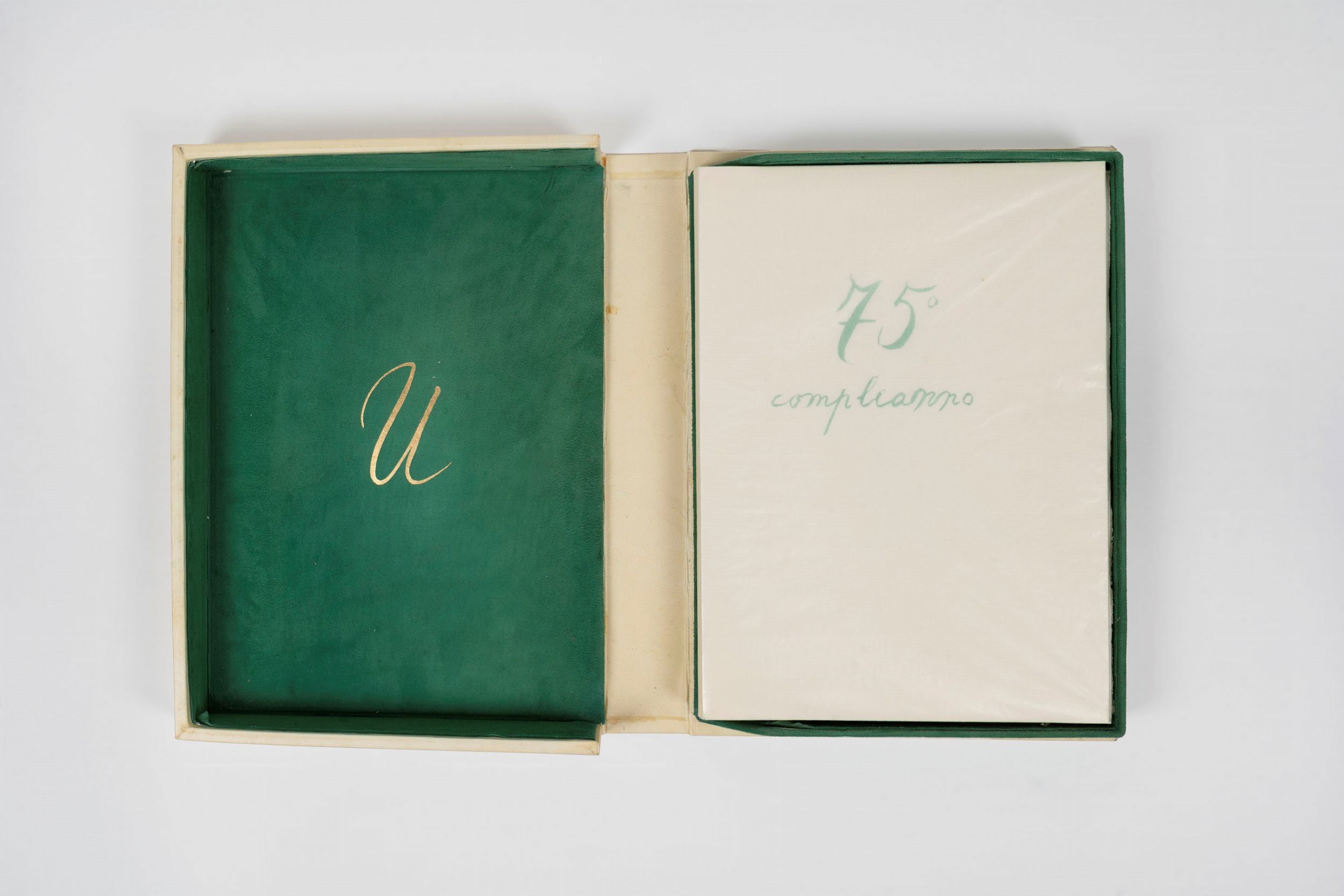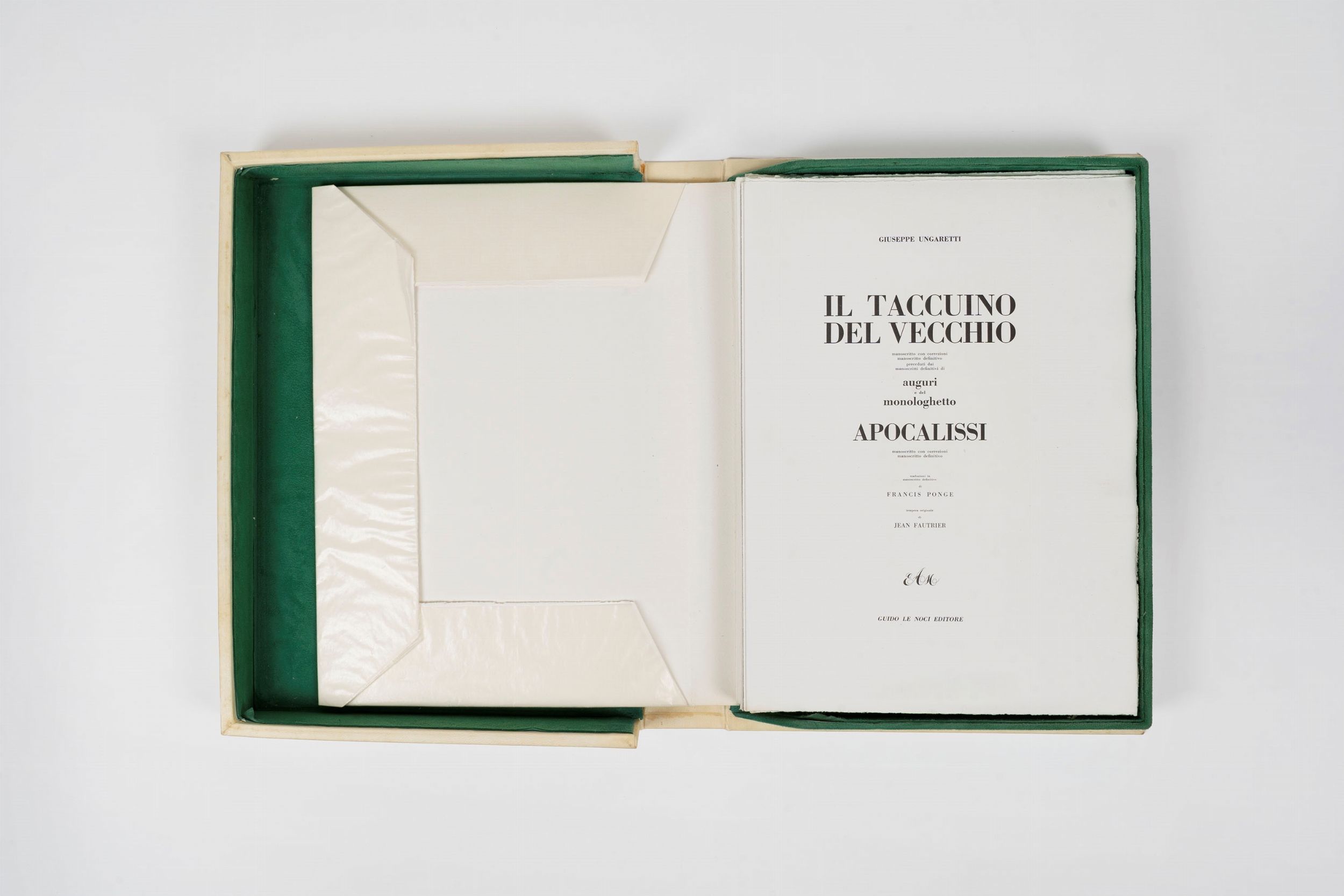 Entro custodia originale in pergamena rivestita all'interno da pelle scamosciata verde smeraldo, recante in oro, nei piatti interni, il monogramma di Ungaretti.