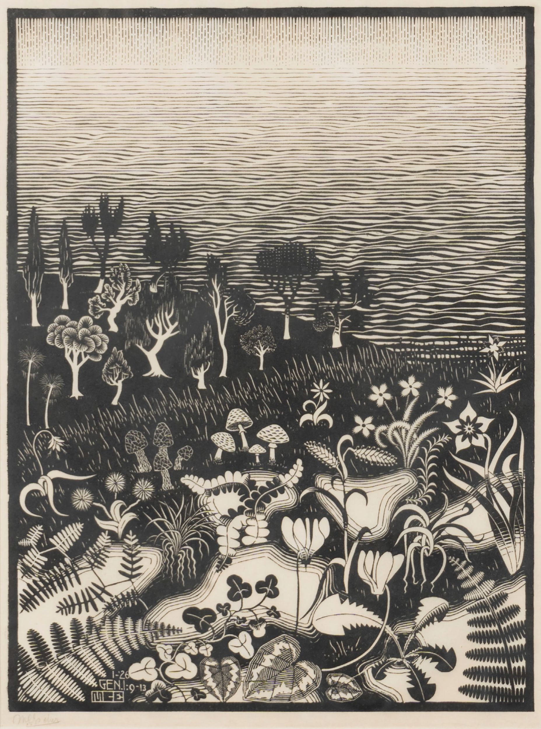 M.C. EscherIn basso a sinistra nella lastra la data 1-'26 (gennaio 1926), l'indicazione: GEN.1: 9-13 (Genesi, capitolo 1, versetti 9-13) seguita dal monogramma: MCE (Maurits Cornelis Escher).