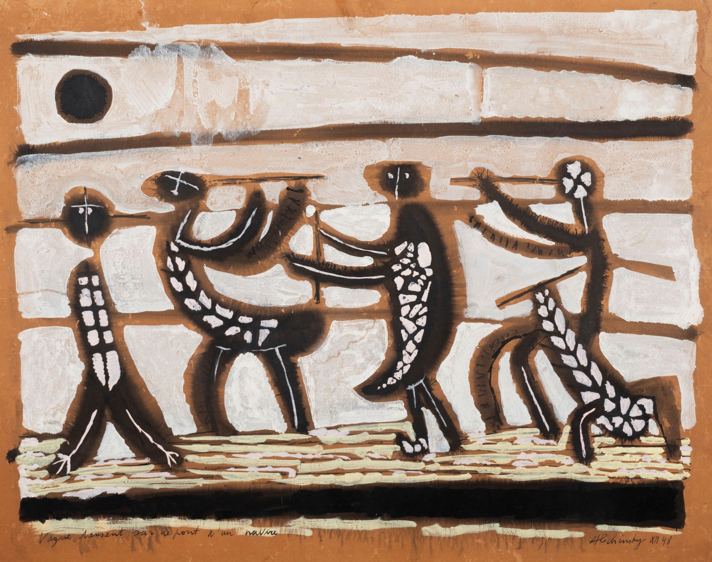 Firmato in basso a destra: Alechinsky XII 48Titolo iscritto in basso a sinistra: Vague dansant sur le pont d'un navireAl verso, uno studio a temperaI margini presentano alcuni restauri