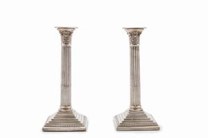in argento, Peso kg 1,649 h cm 45,50 XX secolo a due fiamme, base quadrata, fusto liscio con decoro a greca, [..]