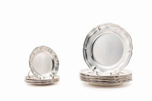 in argento, Peso kg 3,382 Italia, metà XX secolo sei piattini da pane (cm 14) e dodici piatti (cm 21), punzoni [..]