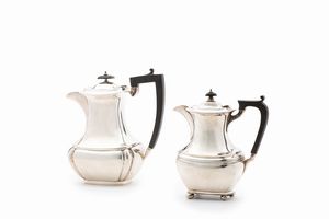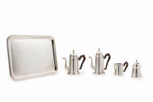 in argento, Peso kg 2,720 h cm 9,00-14,00-20,00-22,00 cm 32,00x42,00 Italia, XX secolo composto da teiera, caffettiera, [..]