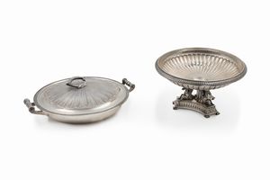 in argento, Peso kg 2,178 cm 20x25-17x19 XX secolo corpo polilobato, a due manici, coperchi con prese.