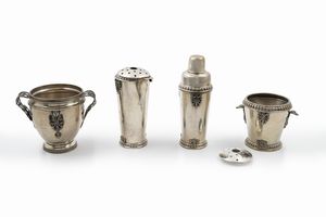 in argento, Peso kg 2,135 h cm 13,00-15,70-20,20-25,00 Italia, XX secolo composto da uno shaker, un versatoio [..]