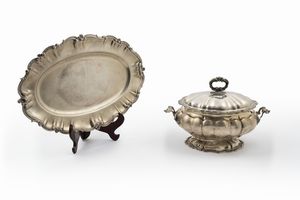 in argento, Peso kg 2,660 cm 24,00x35,30-33,70x50,00 diametro cm 38,00 XX secolo vassoio ovale con profili polilobati [..]