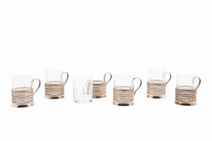 in metallo argentato, Peso g 536,00 (al netto dei bicchieri in vetro) XX secolo in filigrana a decoro traforato, [..]