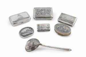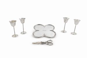 in argento e vermeil, Peso g 602,00 cm 3,50x5,50-6,00x5,00-5,00x8,00-5,50x10,00-7,00x10,00-17,50 XIX-XX secolo [..]