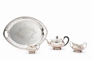 in argento, Peso kg 1,600 h cm 12,50-17,00-19,00-24,00 Alessandria, XX secolo composto da caffettiera, teiera, [..]