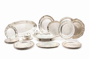 in argento, Peso kg 9,580 Italia, XX secolo composto da 20 oggetti: una pesciera ovale (cm 26x59), due vassoi [..]