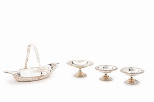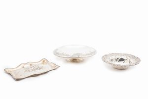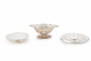 in argento, Peso kg 1,050 diametro cm 16,00-13,00- 33,00x22,00 USA e Inghilterra, inizi XX secolo alzate con [..]