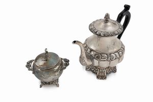 in argento, Peso g 776,00 cm 10,50x22,00-8,00x14,00 Italia, XIX secolo teiera poggiante su quattro piedini a [..]