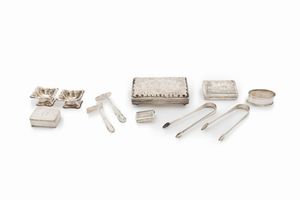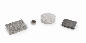 in argento 800 e 925, Peso g 510,00 XX secolo composto da due scatole, due porta pillole, un porta tovagliolo, [..]