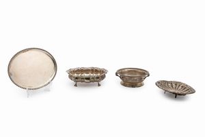 in argento, Peso kg 1,485 cm 21,00x34,50 diametri cm 19,00-26,50 Italia, XX secolo poggianti su piedini zoomorfi, [..]
