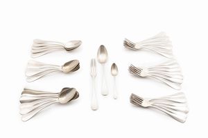 in argento, Peso kg 2,536 XX secolo composto da diciotto cucchiai, venti forchette e un cucchiaino, con iniziali [..]