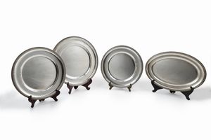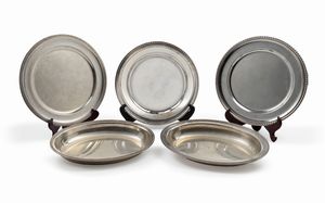 in argento, Peso kg 2,995 cm 33,50-38,00-28,50x42,00 Italia, XX secolo piatti di forma rotonda e vassoio ovale, [..]