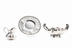in argento, Peso kg 2,810 XX secolo un vassoio ovale a decoro martellato e inciso (cm 30x37), una jatte centrotavola [..]