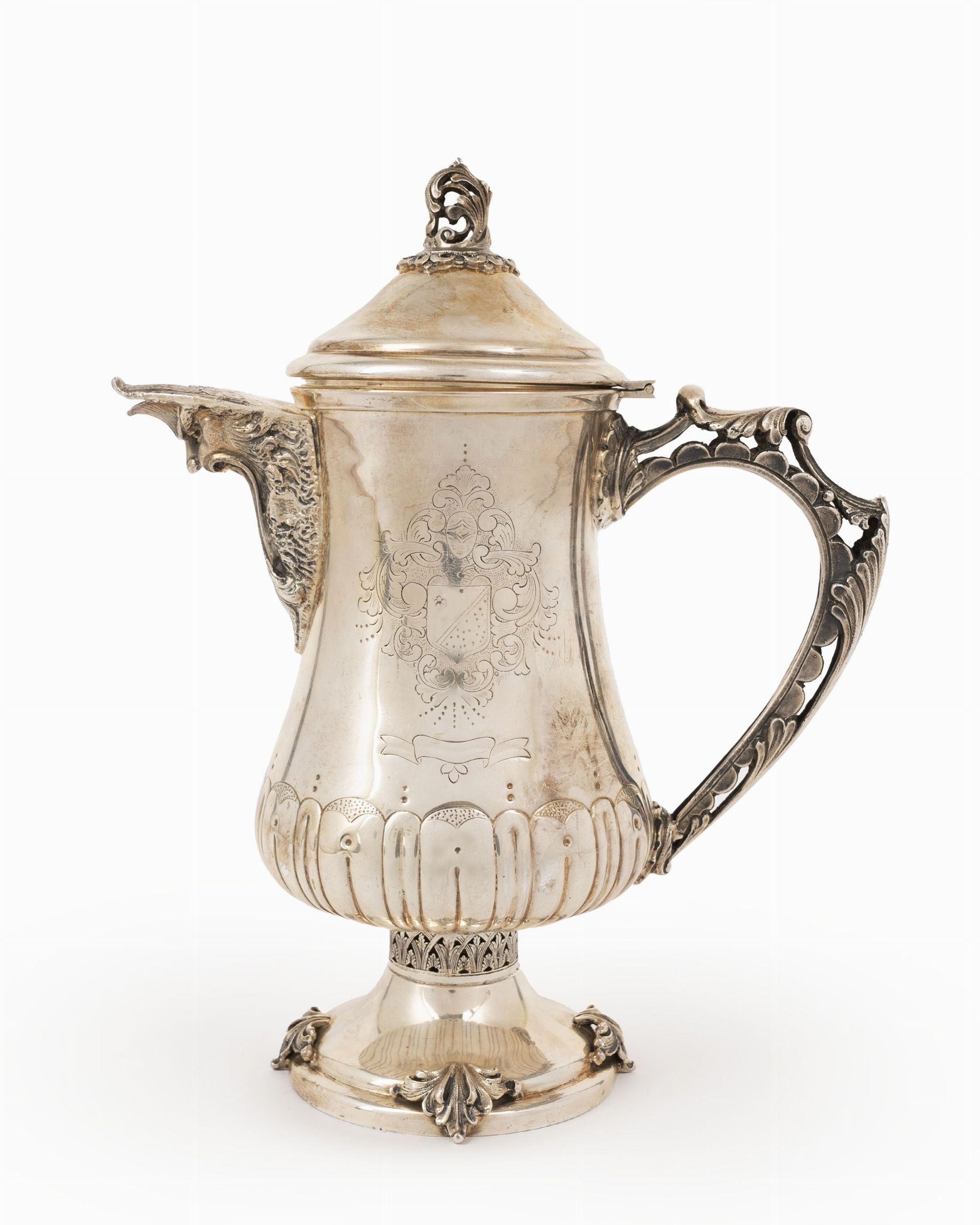 Italia, XX secolo base rotonda con applicazioni a foglia, manico, presa e beccuccio a motivi vegetali e zoomorfi, fusto inciso con stemma.