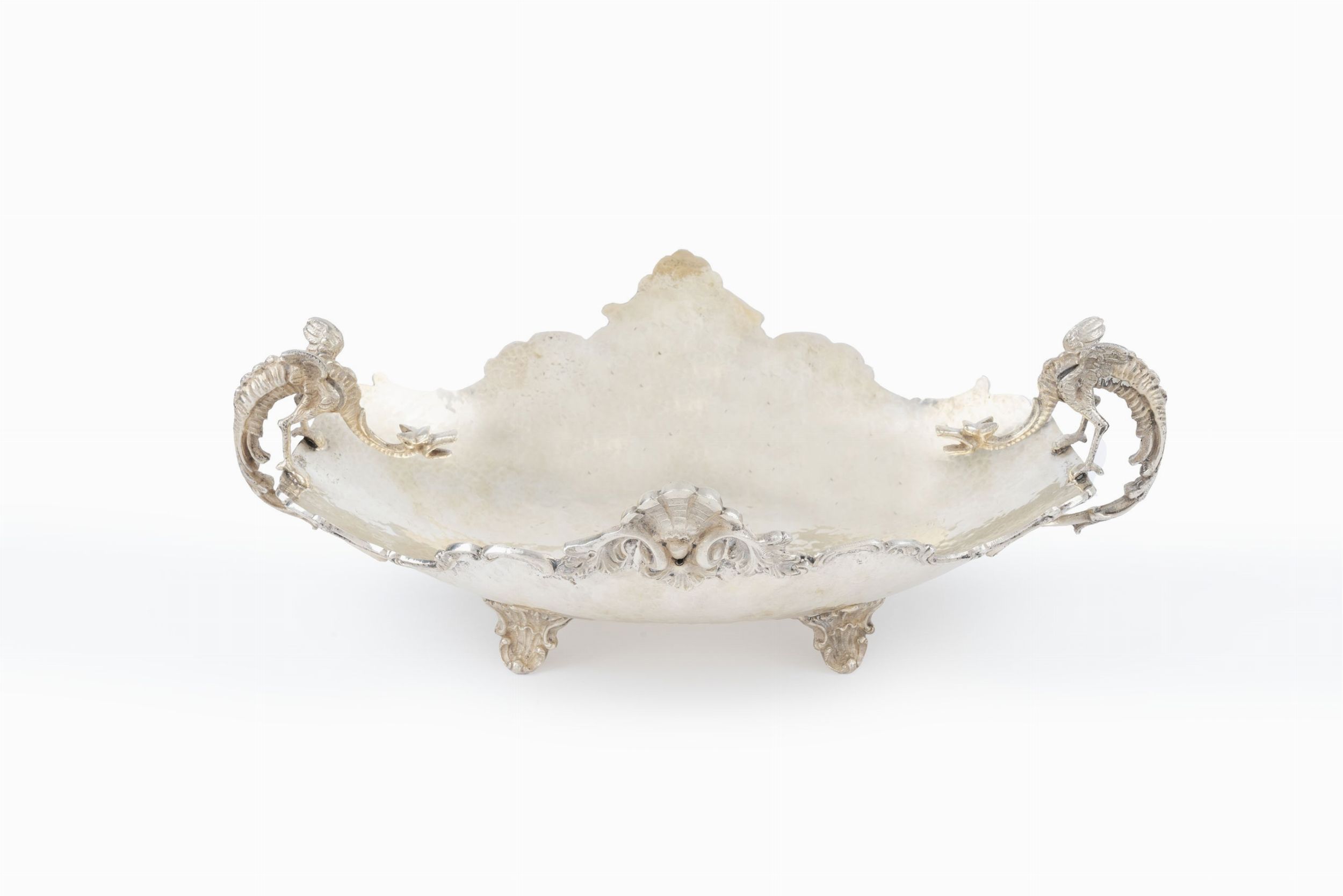 Firenze, XX secolo di forma ovale, poggiante su quattro piedini a motivo fogliaceo, corpo martellato e prese a forma di drago.