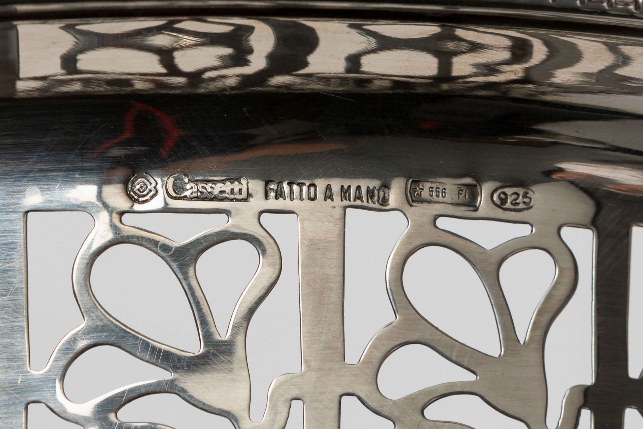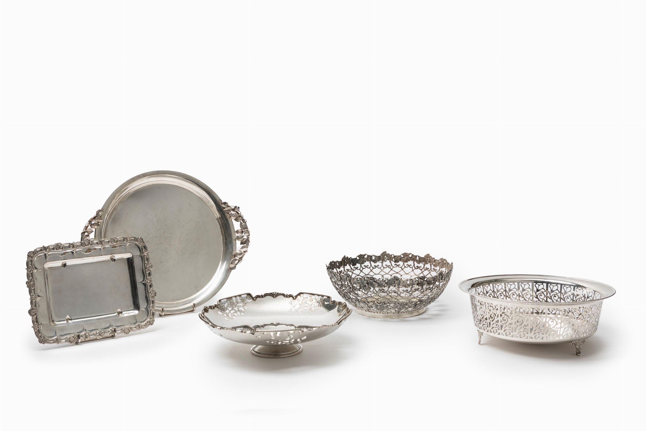 Italia, XX secolo due cestini traforati, un'alzata, un vassoio a due manici con decoro a melograni, un vassoio di forma rettangolare.