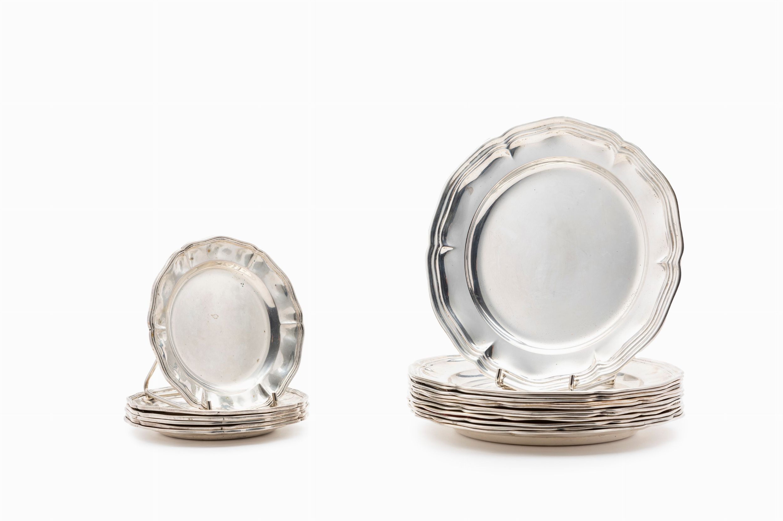 Italia, metà XX secolo sei piattini da pane (cm 14) e dodici piatti (cm 21), punzoni del Fascio, con scatola.