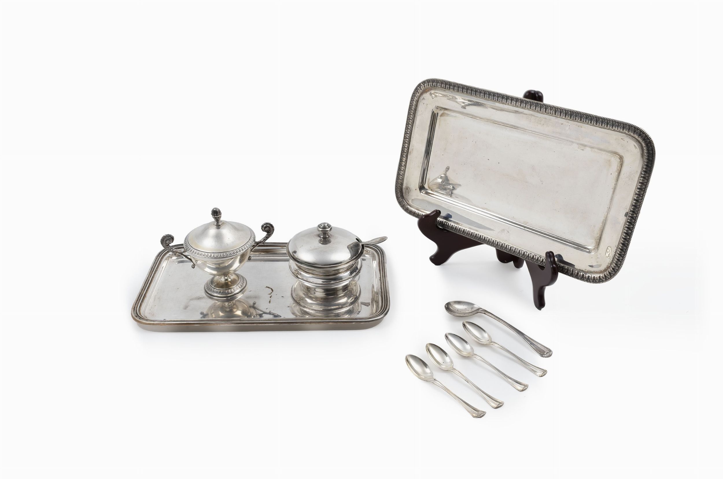 Italia, XX secolo composto da due vassoi, una zuccheriera, una formaggiera in argento 925, cinque cucchiaini con differenti decori e un cucchiaino da infante.