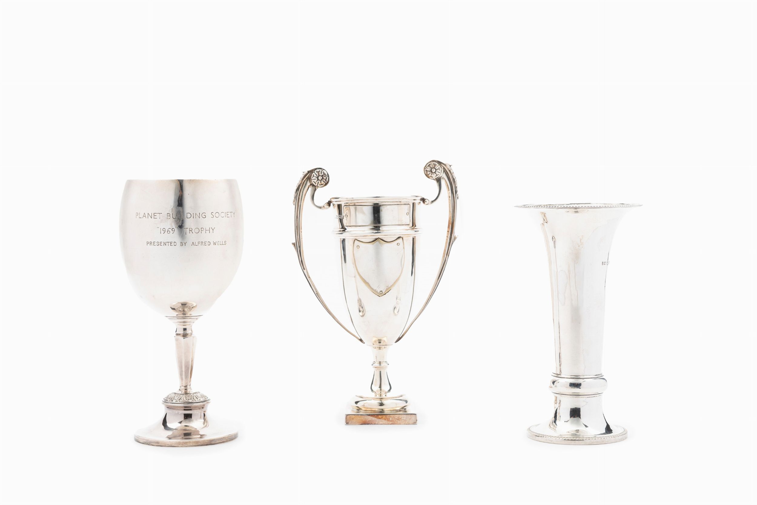 Inghilterra, Londra e Sheffield, inizi XX sec. una coppa con incisione, una coppa a due manici, un vaso a calice, difetti (segni d'uso).