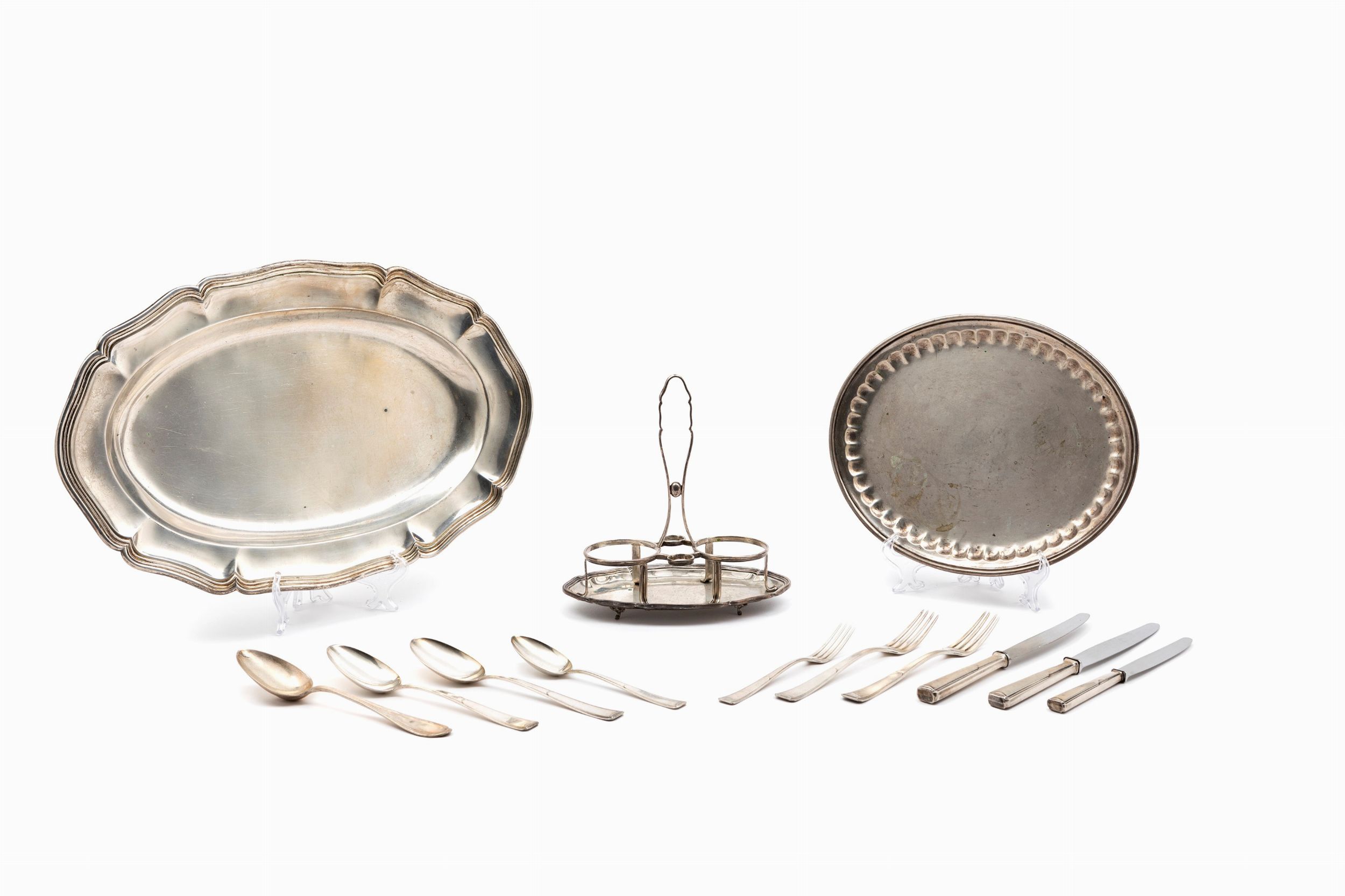 Italia, XX secolo vassoio da portata di forma ovale con bordo mosso, vassoio ovale con motivi scanalati, oliera e posate spaiate (tre coltelli, tre forchette, quattro cucchiai).