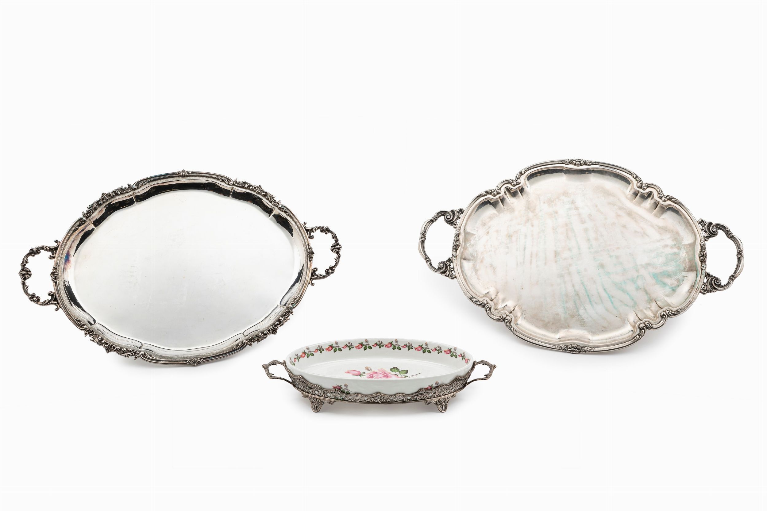 in argento, Peso kg 4,938 (al netto della ceramica) cm 66,00x41,00-60,00x39,00-44,00x21,00