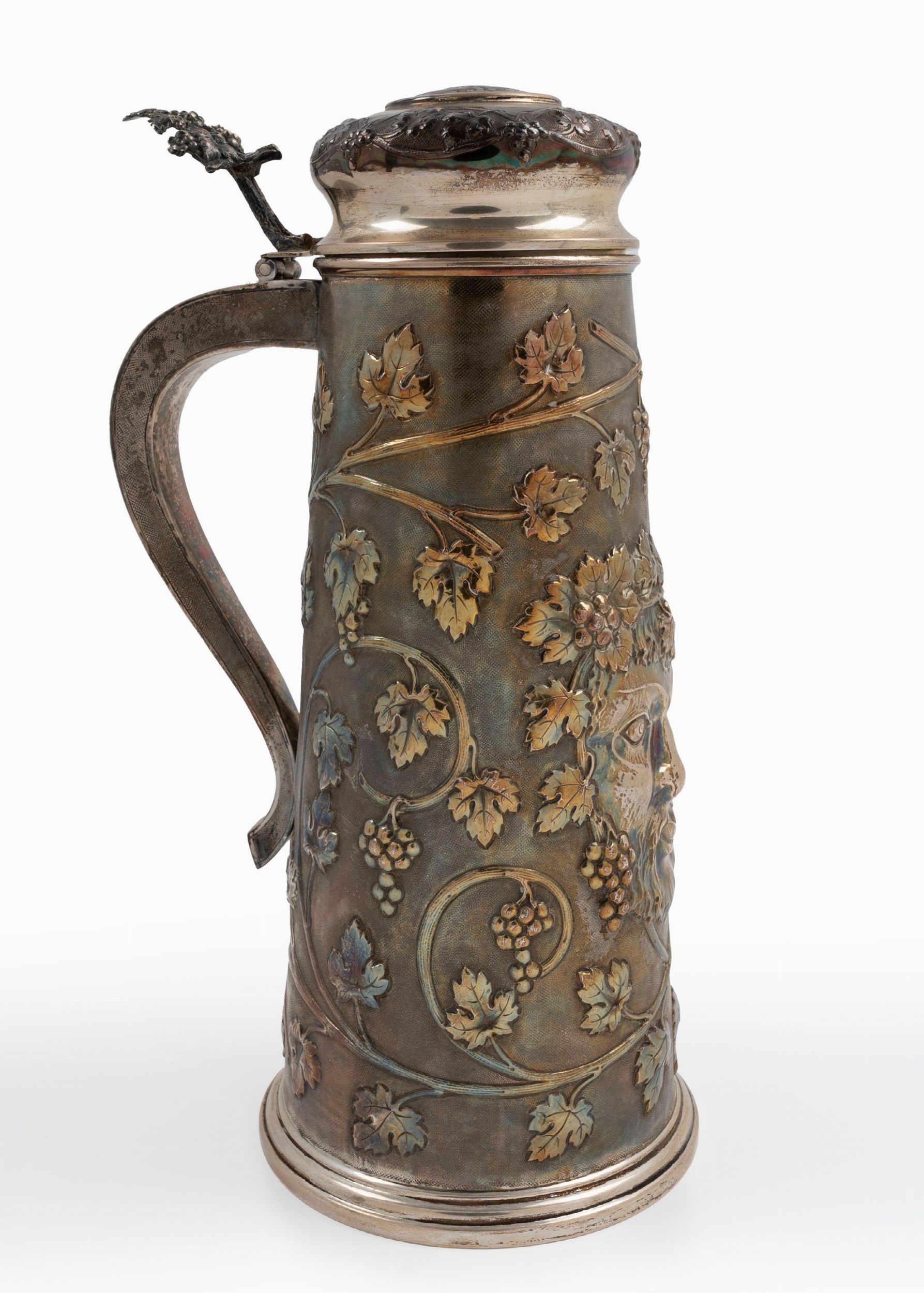 Italia, XX secolo al centro altorilievo con volto di Bacco contornato da foglie di vite e grappoli d'uva, manico con decori incisi e coperchio con stemma.