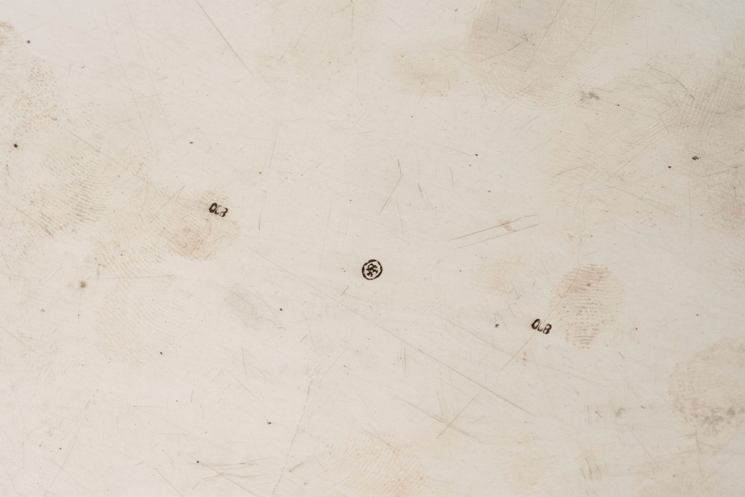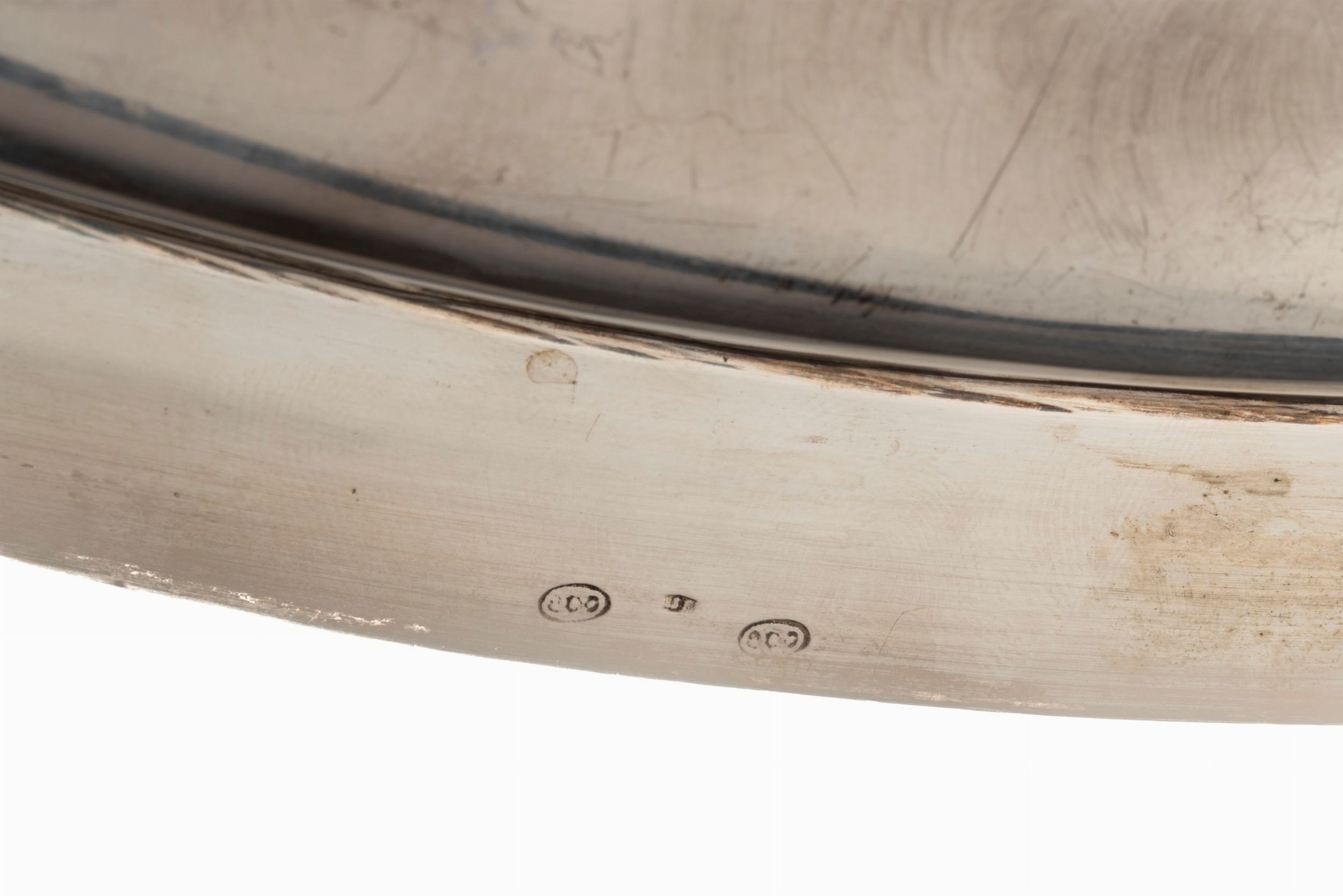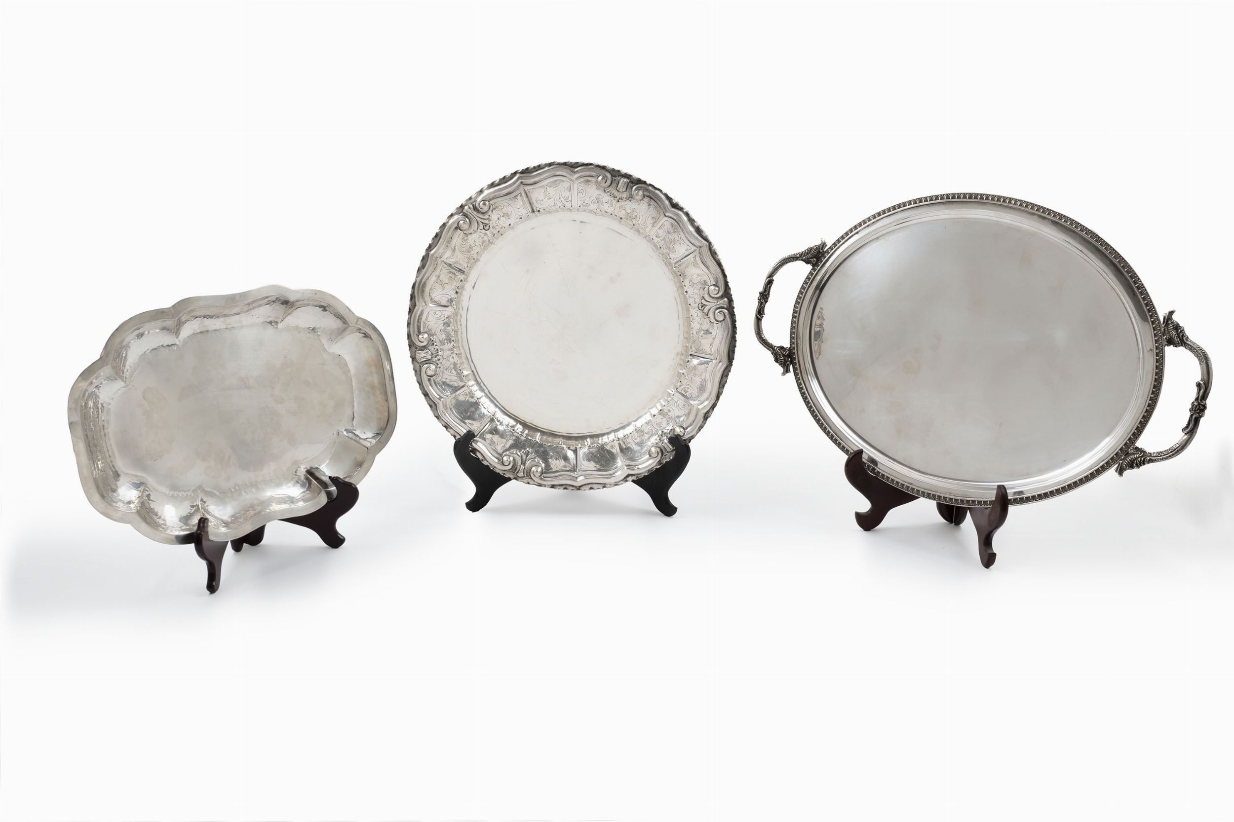 in argento, Peso kg 2,660 cm 24,00x35,30-33,70x50,00 diametro cm 38,00 XX secolo vassoio ovale con profili polilobati e decoro martellato, piatto con bordo sbalzato e cesellato a motivi vegetali e guantiera con decoro in stile Impero e manici con delfini.